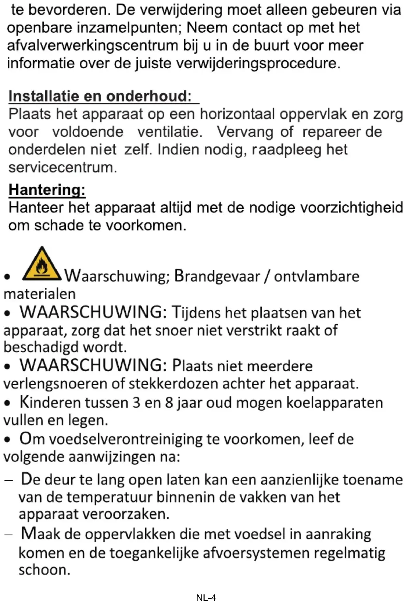 Om mogelijke schade aan het milieu of de menselijke gezondheid door ongecontroleerde afvalverwijdering te voorkomen, recycle het apparaat op verantwoorde wijze om duurzaam hergebruik van materiaalbronnen, de koelmiddelen en de blaasgassen met brandbare isolatie NL-3NL-4 Voordat u een oude diepvries of koelkast met slot/vergrendeling afdankt, dient u ervoor te zorgen dat het slot/de vergrendeling wordt stukgemaakt om te voorkomen dat jonge kinderen tijdens het spelen opgesloten kunnen raken