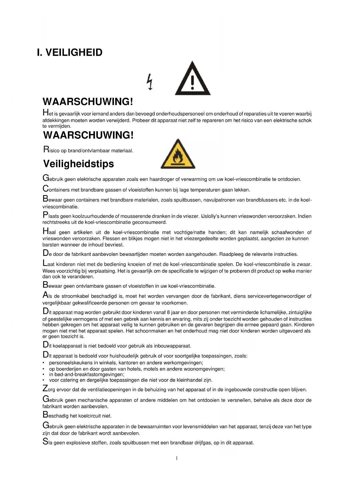 WAARSCHUWING! Het is gevaarlijk voor iemand anders dan bevoegd onderhoudspersoneel om onderhoud of reparaties uit te voeren waarbij afdekkingen moeten worden verwijderd. Probeer dit apparaat niet zelf te repareren om het risico van een elektrische schok te vermijden. WAARSCHUWING! Risico op brand/ontvlambaar materiaal. Veiligheidstips Gebruik geen elektrische apparaten zoals een haardroger of verwarming om uw koel-vriescombinatie te ontdooien. Containers met brandbare gassen of vloeistoffen kunnen bij lage temperaturen gaan lekken. Bewaar geen containers met brandbare materialen, zoals spuitbussen, navulpatronen van brandblussers etc. in de koel- vriescombinatie. Plaats geen koolzuurhoudende of mousserende dranken in de vriezer. IJslolly's kunnen vrieswonden veroorzaken. Indien rechtstreeks uit de koel-vriescombinatie geconsumeerd. Haal geen artikelen uit de koel-vriescombinatie met vochtige/natte handen; dit kan namelijk schaafwonden of vrieswonden veroorzaken. Flessen en blikjes mogen niet in het vriezergedeelte worden geplaatst, aangezien ze kunnen barsten wanneer de inhoud bevriest. De door de fabrikant aanbevolen bewaartijden moeten worden aangehouden. Raadpleeg de relevante instructies. Laat kinderen niet met de bediening knoeien of met de koel-vriescombinatie spelen. De koel-vriescombinatie is zwaar. Wees voorzichtig bij verplaatsing. Het is gevaarlijk om de specificatie te wijzigen of te proberen dit product op welke manier dan ook te veranderen. Bewaar geen ontvlambare gassen of vloeistoffen in uw koel-vriescombinatie. Als de stroomkabel beschadigd is, moet het worden vervangen door de fabrikant, diens servicevertegenwoordiger of vergelijkbaar gekwalificeerde personen om gevaar te voorkomen. Dit apparaat mag worden gebruikt door kinderen vanaf 8 jaar en door personen met verminderde lichamelijke, zintuiglijke of geestelijke vermogens of met een gebrek aan kennis en ervaring, mits zij onder toezicht worden gehouden of instructies hebben gekregen om het apparaat veilig te kunnen gebruiken en de gevaren begrijpen die ermee gepaard gaan. Kinderen mogen niet met het apparaat spelen. Het schoonmaken en het onderhoud mag niet door kinderen worden uitgevoerd als er geen toezicht is. Dit koelapparaat is niet bedoeld voor gebruik als inbouwapparaat. Dit apparaat is bedoeld voor huishoudelijk gebruik of voor soortgelijke toepassingen, zoals: