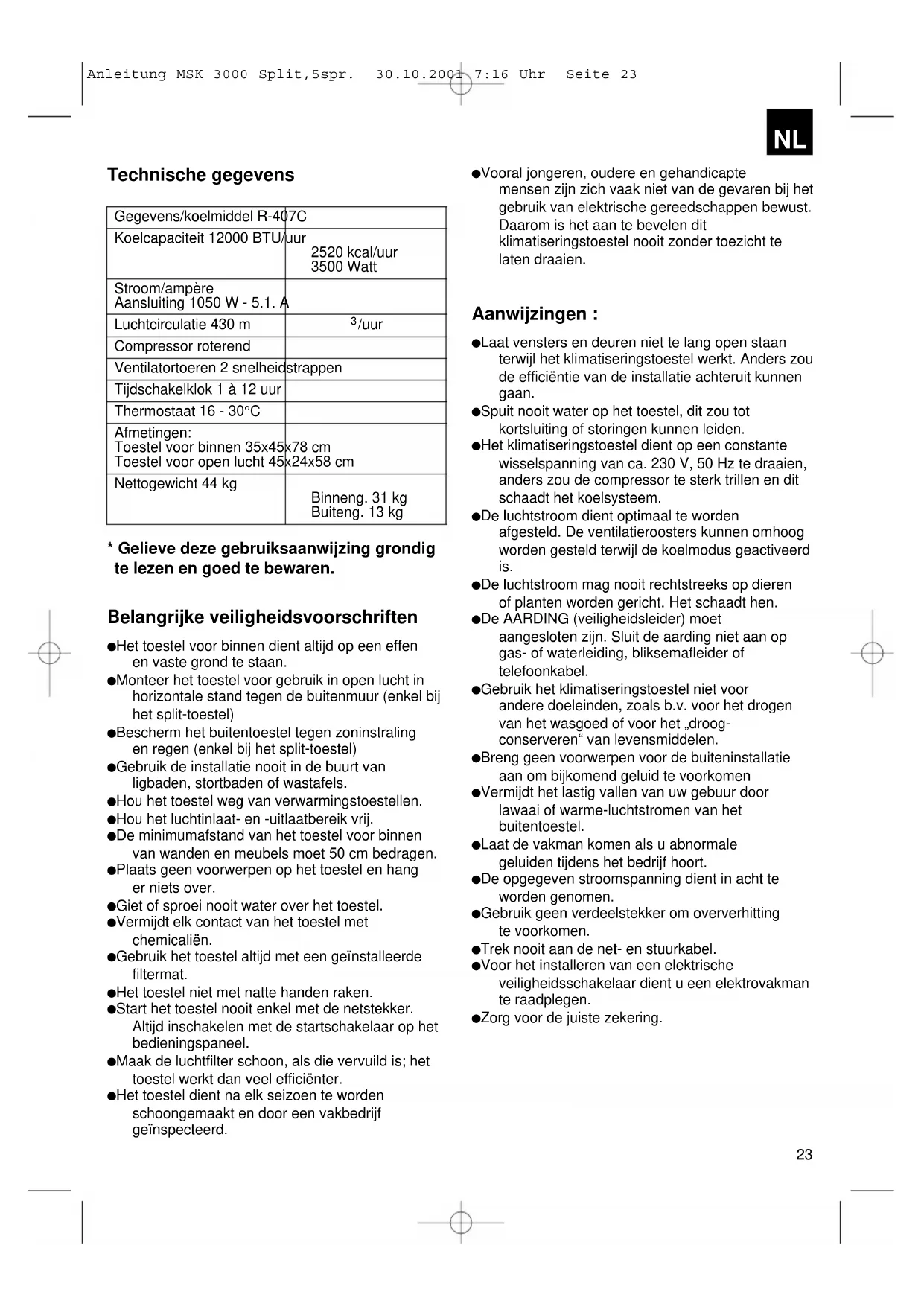Anleitung MSK 3000 Split,5spr. 30.10.2001 7:16 Uhr Seite 23 De stroomkabels (toevoerleidingen) moeten een voldoend grote doorsnede hebben. Het klimatiseringstoestel enkel aansluiten op een naar behoren geïnstalleerd netstopcontact 230 V, 50 Hz. Steek geen voorwerpen in de luchtaanzuiging of luchtuitlaat. Let op ! Risico een verwonding op te lopen en vernietiging van het toestel. Als u het toestel van het net wilt scheiden, trek dan nooit aan de netkabel of aan andere verbindingskabels. Terwijl het klimatiseringstoestel in gebruik is moeten deuren en vensters dicht zijn. Als deuren en vensters geopend zijn kan het toestel niet naar behoren werken ! Het kan gebeuren dat geuren uit het binnentoestel ontsnappen; dit is geen functionele storing of defect van het toestel. Dit is een teken van verrijking door sigarettenrook, meubilair, keukendamp enz. Let op ! Het klimatiseringstoestel moet zeker een eigen toevoerleiding hebben en mag om veiligheidsredenen niet d.m.v. een verdeelstekker samen met andere toestellen worden aangesloten. Herstel- en onderhoudswerkzaamheden mogen enkel door deskundigen op het gebied van elektriciteit en koeltechniek worden uitgevoerd. Ontvochtigen van de lucht bij regenweer of bij hoge luchtvochtigheid Het klimatiseringstoestel kan de kamerlucht ontvochtigen, de lucht droger en aangenamer maken zonder van kamertemperatuur te veranderen.