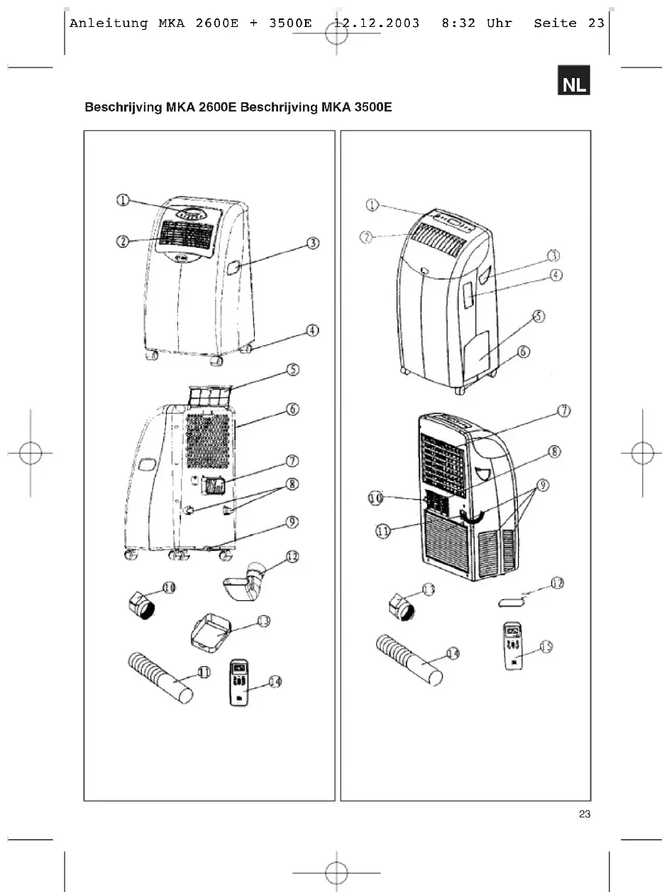 Beschrijving van het toestel MKA 2600 E 1 Bedieningsgedeelte 2 Luchtuitlaatrooster 3 Handvat 4 Loopwieltjes 5 Luchtfilter 6 Luchtaanzuiging 7 Opening slang voor afgevoerde lucht 8 Netkabelopwikkelaar 9 Stop 10 Slang voor afgevoerde lucht aansluitstuk 11 Slang voor de afgevoerde lucht 12 Bocht 13 Wateropvangbak 14 Afstandsbediening z.b. Schuimstof met uitsparing z.b. Schuimstof zonder uitsparing z.b. Doorvoerring z.b. Afdekkap MKA 3500 E 1 Bedieningsgedeelte 2 Luchtuitlaatrooster 3 Handvat 4 Opbergvak voor afstandsbediening 5 Watertank 6 Loopwieltjes 7 Luchtaanzuiging 8 Opening slang voor afgevoerde lucht 9 Buitenste luchtaanzuiging 10 Condensatiewateropening 11 Netkabel 12 Bocht 13 Slang voor afgevoerde lucht aansluitstuk 14 Slang voor de afgevoerde lucht 15 Afstandsbediening z.b. Schuimstof met uitsparing z.b. Schuimstof zonder uitsparing z.b. Doorvoerring z.b. Afdekkap Inbedrijfstelling Aanwijzing: De toestellen werken in een temperatuurbereik van 15 tot 35°C. De compressor wordt tijdverschoven ingeschakeld. Terwijl het toestel werkt wordt de momentele kamertemperatuur in het LCD display aangegeven. In de modus zonder vooraf ingestelde tijd (timer) wordt de looptijd sinds het inschakelen van het toestel aangegeven. Beschrijving - bedieningsveld Bedieningsveld MKA 2600 E / bedieningsveld MKA 3500 E 1 AAN / UIT-schakelaar 2 Moduskeuzeschakelaar (mode) 3 Snelheidskeuzeschakelaar (speed) 4 “Warmer – koeler” keuzeschakelaar ((temp.up „“ – temp.down „“) 5 Tijdkeuzeschakelaar (timer) 6 Instellen van de verticale en horizontale lamellen (enkel bij MKA 3500 E) 7 LCD displayveld 8 Temperatuuraanduiding 9 Indicatie “automatische modus” 10 Indicatie “koelen” 11 Indicatie “ventilator” 12 Indicatie “ventilatortoeren” 13 Indicatie “ontvochtiging” 14 Indicatie “tijd” 15 Indicatie “foutcode” 16 Indicatie “lamellenverstelling” (enkel bij MKA 3500 E)