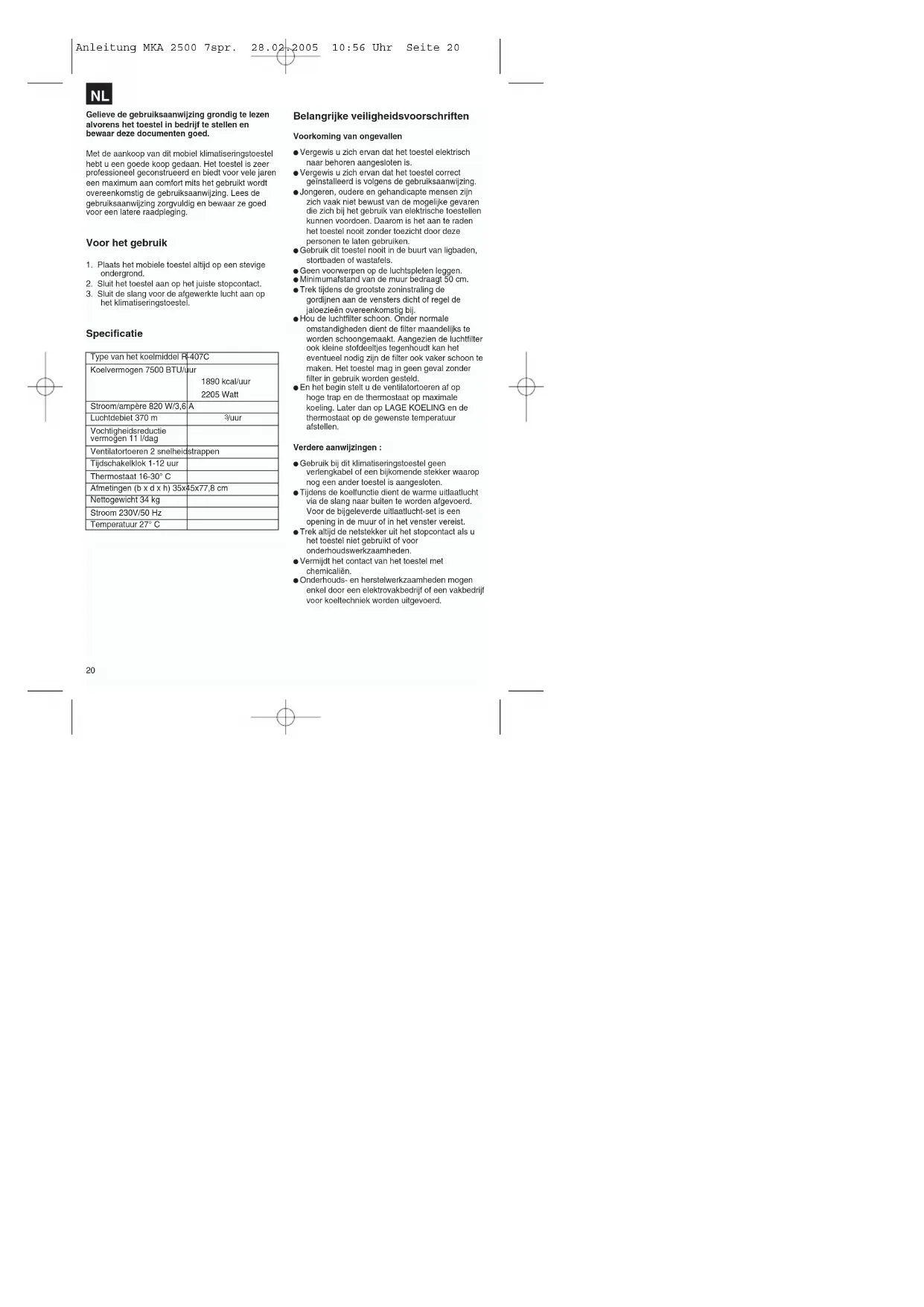 Anleitung MKA 2500 7spr. 28.02.2005 10:56 Uhr Seite 19Gelieve de gebruiksaanwijzing grondig te lezen alvorens het toestel in bedrijf te stellen en bewaar deze documenten goed. Met de aankoop van dit mobiel klimatiseringstoestel hebt u een goede koop gedaan. Het toestel is zeer professioneel geconstrueerd en biedt voor vele jaren een maximum aan comfort mits het gebruikt wordt overeenkomstig de gebruiksaanwijzing. Lees de gebruiksaanwijzing zorgvuldig en bewaar ze goed voor een latere raadpleging. Voor het gebruik