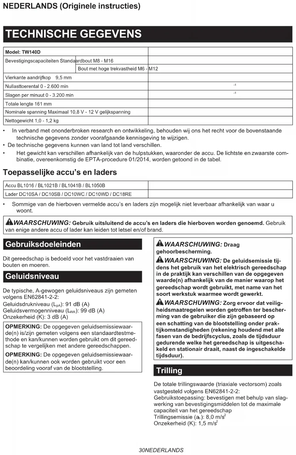 - Sommigevandehierbovenvermeldeaccu’senladerszijnmogelijknietleverbaarafhankelijkvanwaaru woont. WAARSCHUWING: Gebruik uitsluitend de accu’s en laders die hierboven worden genoemd. Gebruik van enige andere accu of lader kan leiden tot letsel en/of brand. Gebruiksdoeleinden Dit gereedschap is bedoeld voor het vastdraaien van bouten en moeren. Geluidsniveau Detypische,A-gewogengeluidsniveauszijngemeten volgens EN62841-2-2: Geluidsdrukniveau(L