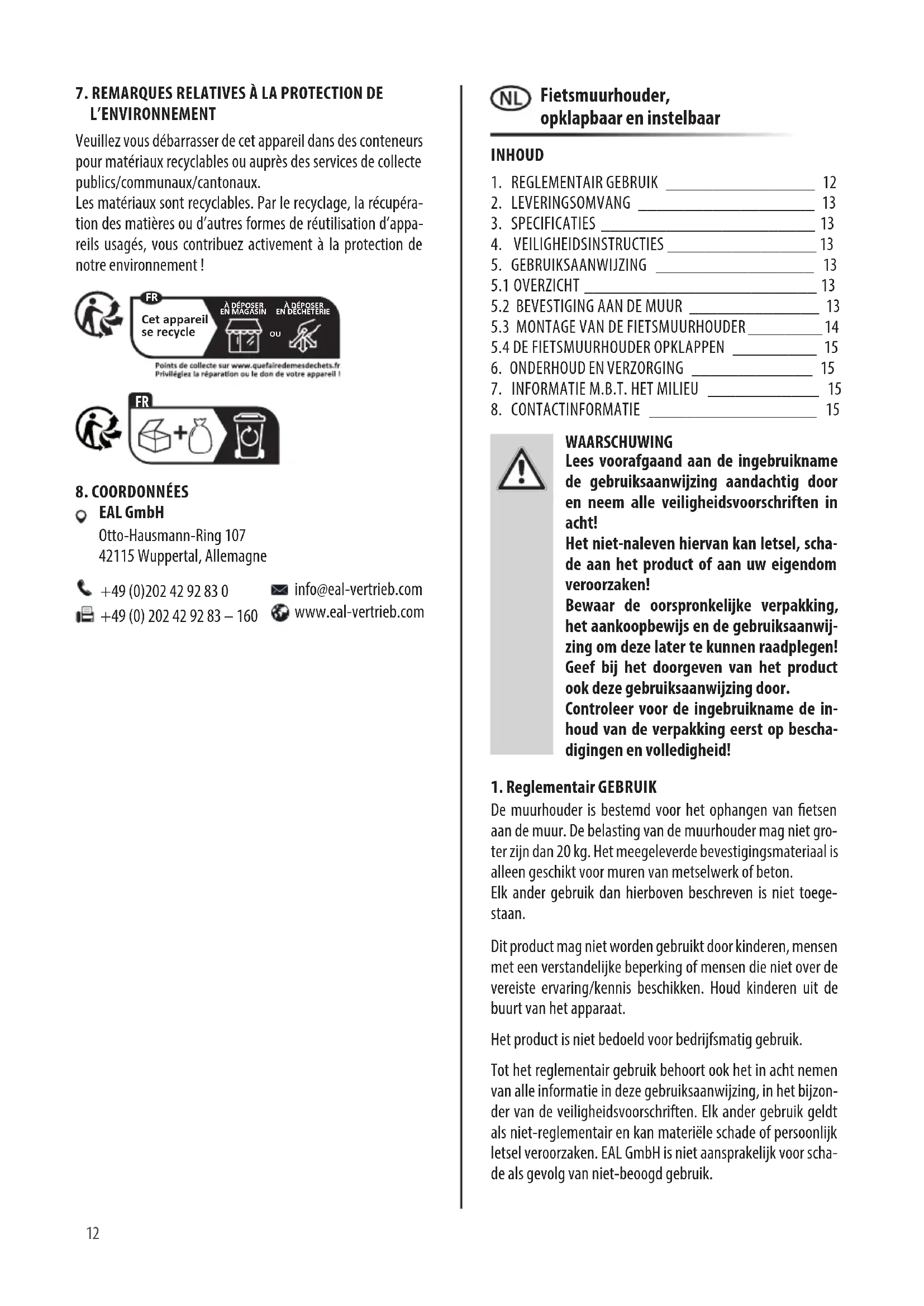 INHOUD Lees voorafgaand aan de ingebruikname de gebruiksaanwijzing aandachtig door en neem alle veiligheidsvoorschriften in acht! Het niet-naleven hiervan kan letsel, scha- de aan het product of aan uw eigendom veroorzaken! Bewaar de oorspronkelijke verpakking, het aankoopbewijs en de gebruiksaanwij- zing om deze later te kunnen raadplegen! Geef bij het doorgeven van het product ook deze gebruiksaanwijzing door. Controleer voor de ingebruikname de in- houd van de verpakking eerst op bescha- digingen en volledigheid! WAARSCHUWING Fietsmuurhouder, opklapbaar en instelbaar