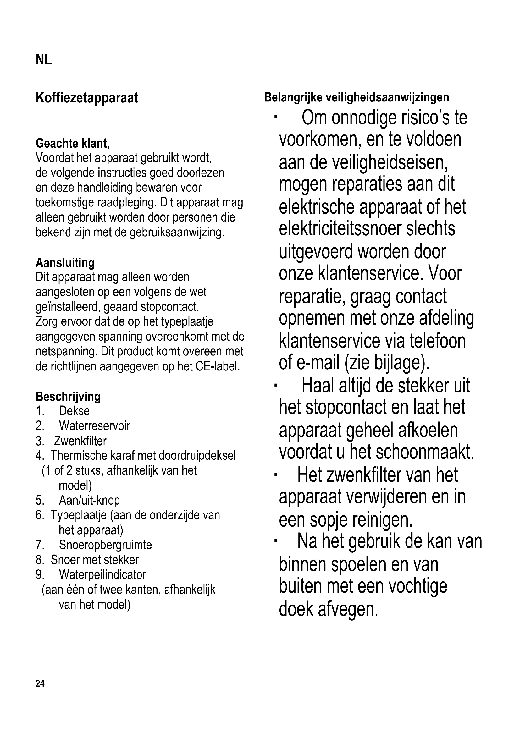 (aan één of twee kanten, afhankelijk van het model) Belangrijke veiligheidsaanwijzingen ∙ Om onnodige risico’s te voorkomen, en te voldoen aan de veiligheidseisen, mogen reparaties aan dit elektrische apparaat of het elektriciteitssnoer slechts uitgevoerd worden door onze klantenservice. Voor reparatie, graag contact opnemen met onze afdeling klantenservice via telefoon of e-mail (zie bijlage). ∙ Haal altijd de stekker uit het stopcontact en laat het apparaat geheel afkoelen voordat u het schoonmaakt. ∙ Hetzwenkltervanhet apparaat verwijderen en in een sopje reinigen. ∙ Na het gebruik de kan van binnen spoelen en van buiten met een vochtige doek afvegen. NL104 x 142 mm