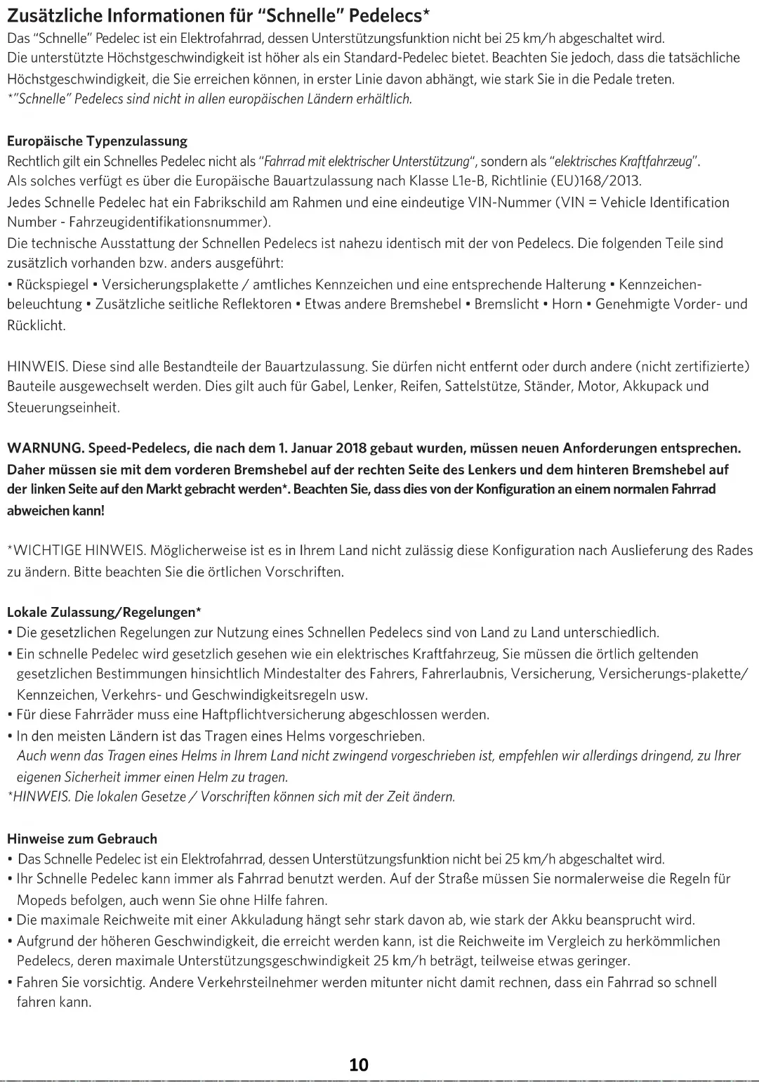 - Omdat de ‘snelle’ elektrische fiets wettelijk wordt gezien als een elektrisch motorvoertuig, moet u voldoen aan de lokale wettelijke regels betreffende de minimum leeftijd van de berijder, rijbewijs, verzekering, verzekeringsplaat/kentekenplaat, verkeers- en snelheidsregels, etc.