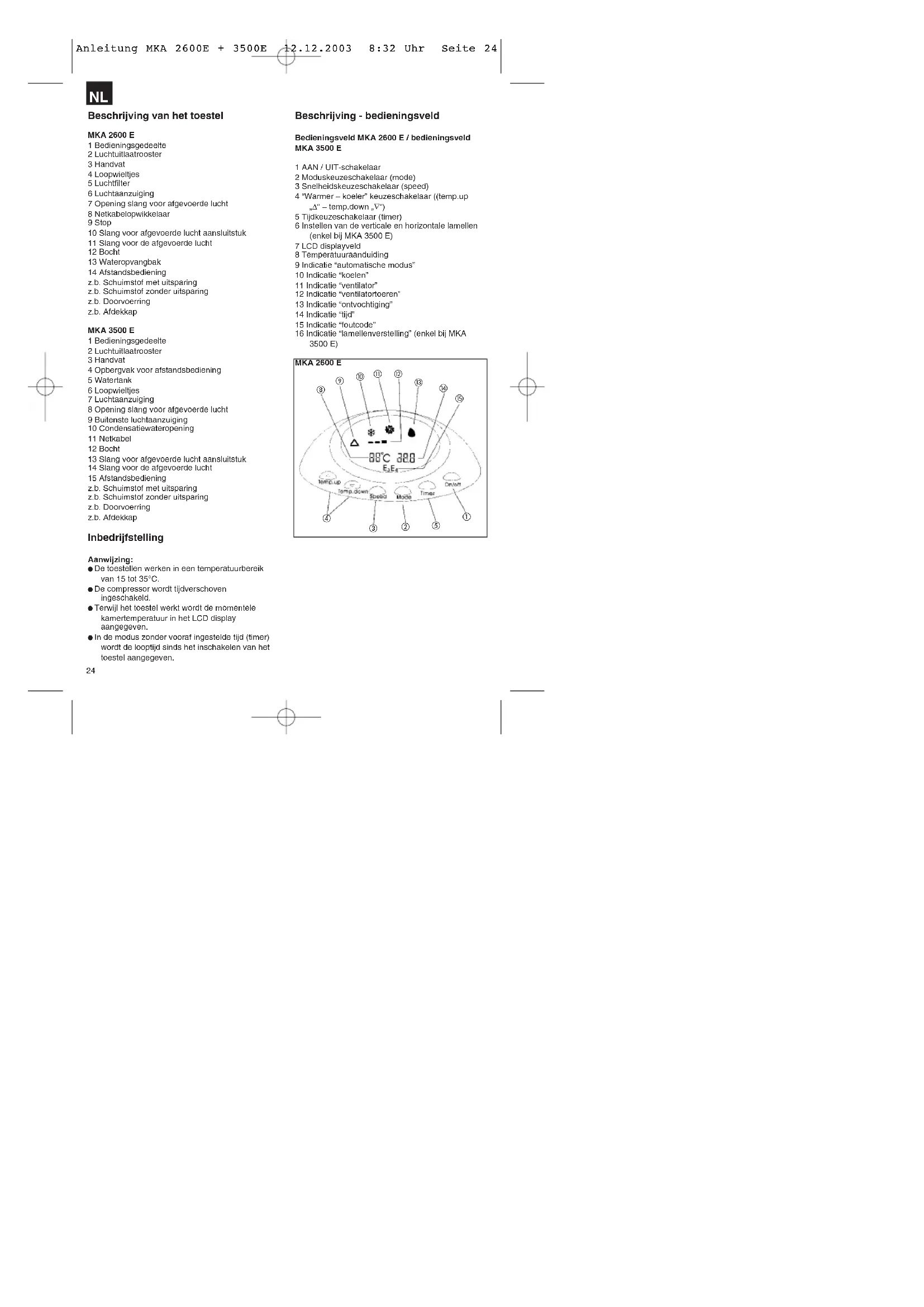 Beschrijving van het toestel MKA 2600 E 1 Bedieningsgedeelte 2 Luchtuitlaatrooster 3 Handvat 4 Loopwieltjes 5 Luchtfilter 6 Luchtaanzuiging 7 Opening slang voor afgevoerde lucht 8 Netkabelopwikkelaar 9 Stop 10 Slang voor afgevoerde lucht aansluitstuk 11 Slang voor de afgevoerde lucht 12 Bocht 13 Wateropvangbak 14 Afstandsbediening z.b. Schuimstof met uitsparing z.b. Schuimstof zonder uitsparing z.b. Doorvoerring z.b. Afdekkap MKA 3500 E 1 Bedieningsgedeelte 2 Luchtuitlaatrooster 3 Handvat 4 Opbergvak voor afstandsbediening 5 Watertank 6 Loopwieltjes 7 Luchtaanzuiging 8 Opening slang voor afgevoerde lucht 9 Buitenste luchtaanzuiging 10 Condensatiewateropening 11 Netkabel 12 Bocht 13 Slang voor afgevoerde lucht aansluitstuk 14 Slang voor de afgevoerde lucht 15 Afstandsbediening z.b. Schuimstof met uitsparing z.b. Schuimstof zonder uitsparing z.b. Doorvoerring z.b. Afdekkap Inbedrijfstelling Aanwijzing: De toestellen werken in een temperatuurbereik van 15 tot 35°C. De compressor wordt tijdverschoven ingeschakeld. Terwijl het toestel werkt wordt de momentele kamertemperatuur in het LCD display aangegeven. In de modus zonder vooraf ingestelde tijd (timer) wordt de looptijd sinds het inschakelen van het toestel aangegeven. Beschrijving - bedieningsveld Bedieningsveld MKA 2600 E / bedieningsveld MKA 3500 E 1 AAN / UIT-schakelaar 2 Moduskeuzeschakelaar (mode) 3 Snelheidskeuzeschakelaar (speed) 4 “Warmer – koeler” keuzeschakelaar ((temp.up „“ – temp.down „“) 5 Tijdkeuzeschakelaar (timer) 6 Instellen van de verticale en horizontale lamellen (enkel bij MKA 3500 E) 7 LCD displayveld 8 Temperatuuraanduiding 9 Indicatie “automatische modus” 10 Indicatie “koelen” 11 Indicatie “ventilator” 12 Indicatie “ventilatortoeren” 13 Indicatie “ontvochtiging” 14 Indicatie “tijd” 15 Indicatie “foutcode” 16 Indicatie “lamellenverstelling” (enkel bij MKA 3500 E)