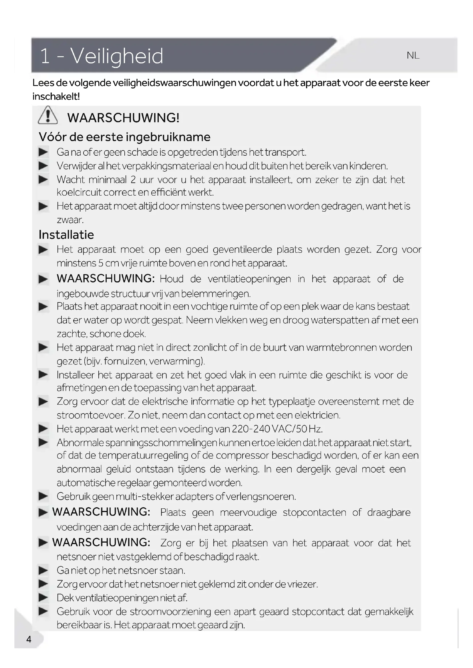 Lees de volgende veiligheidswaarschuwingen voordat u het apparaat voor de eerste keerinschakelt! WAARSCHUWING! Vóór de eerste ingebruikname Ga na of er geen schade is opgetreden tijdens het transport. Verwijder al het verpakkingsmateriaal en houd dit buiten het bereik van kinderen. Wacht minimaal 2 uur voor u het apparaat installeert, om zeker te zijn dat het koelcircuit correct en eƬciënt werkt. Het apparaat moet altijd door minstens twee personen worden gedragen, want het is zwaar. Installatie Het apparaat moet op een goed geventileerde plaats worden gezet. Zorg voor minstens 5 cm vrije ruimte boven en rond het apparaat. WAARSCHUWING: Houd de ventilatieopeningen in het apparaat of de ingebouwde structuur vrij van belemmeringen. Plaats het apparaat nooit in een vochtige ruimte of op een plek waar de kans bestaat dat er water op wordt gespat. Neem vlekken weg en droog waterspatten af met een zachte, schone doek. Het apparaat mag niet in direct zonlicht of in de buurt van warmtebronnen worden gezet (bijv. fornuizen, verwarming). Installeer het apparaat en zet het goed vlak in een ruimte die geschikt is voor de afmetingen en de toepassing van het apparaat. Zorg ervoor dat de elektrische informatie op het typeplaatje overeenstemt met de stroomtoevoer. Zo niet, neem dan contact op met een elektricien. Het apparaat werkt met een voeding van 220-240 VAC/50 Hz. Abnormale spanningsschommelingen kunnen ertoe leiden dat het apparaat niet start, of dat de temperatuurregeling of de compressor beschadigd worden, of er kan een abnormaal geluid ontstaan tijdens de werking. In een dergelijk geval moet een automatische regelaar gemonteerd worden. Gebruik geen multi-stekker adapters of verlengsnoeren. WAARSCHUWING: Plaats geen meervoudige stopcontacten of draagbare voedingen aan de achterzijde van het apparaat. WAARSCHUWING: Zorg er bij het plaatsen van het apparaat voor dat het netsnoer niet vastgeklemd of beschadigd raakt. Ga niet op het netsnoer staan. Zorg ervoor dat het netsnoer niet geklemd zit onder de vriezer. Dek ventilatieopeningen niet af. Gebruik voor de stroomvoorziening een apart geaard stopcontact dat gemakkelijk bereikbaar is. Het apparaat moet geaard zijn. NL5