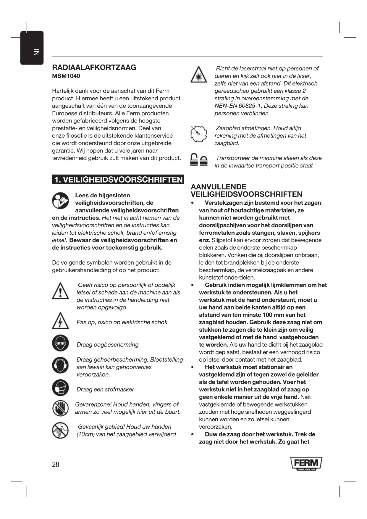 RADIAALAFKORTZAAG MSM1040 Hartelijk dank voor de aanschaf van dit Ferm product. Hiermee heeft u een uitstekend product aangeschaft van één van de toonaangevende Europese distributeurs. Alle Ferm producten worden gefabriceerd volgens de hoogste prestatie- en veiligheidsnormen. Deel van onze filosofie is de uitstekende klantenservice die wordt ondersteund door onze uitgebreide garantie. Wij hopen dat u vele jaren naar tevredenheid gebruik zult maken van dit product.