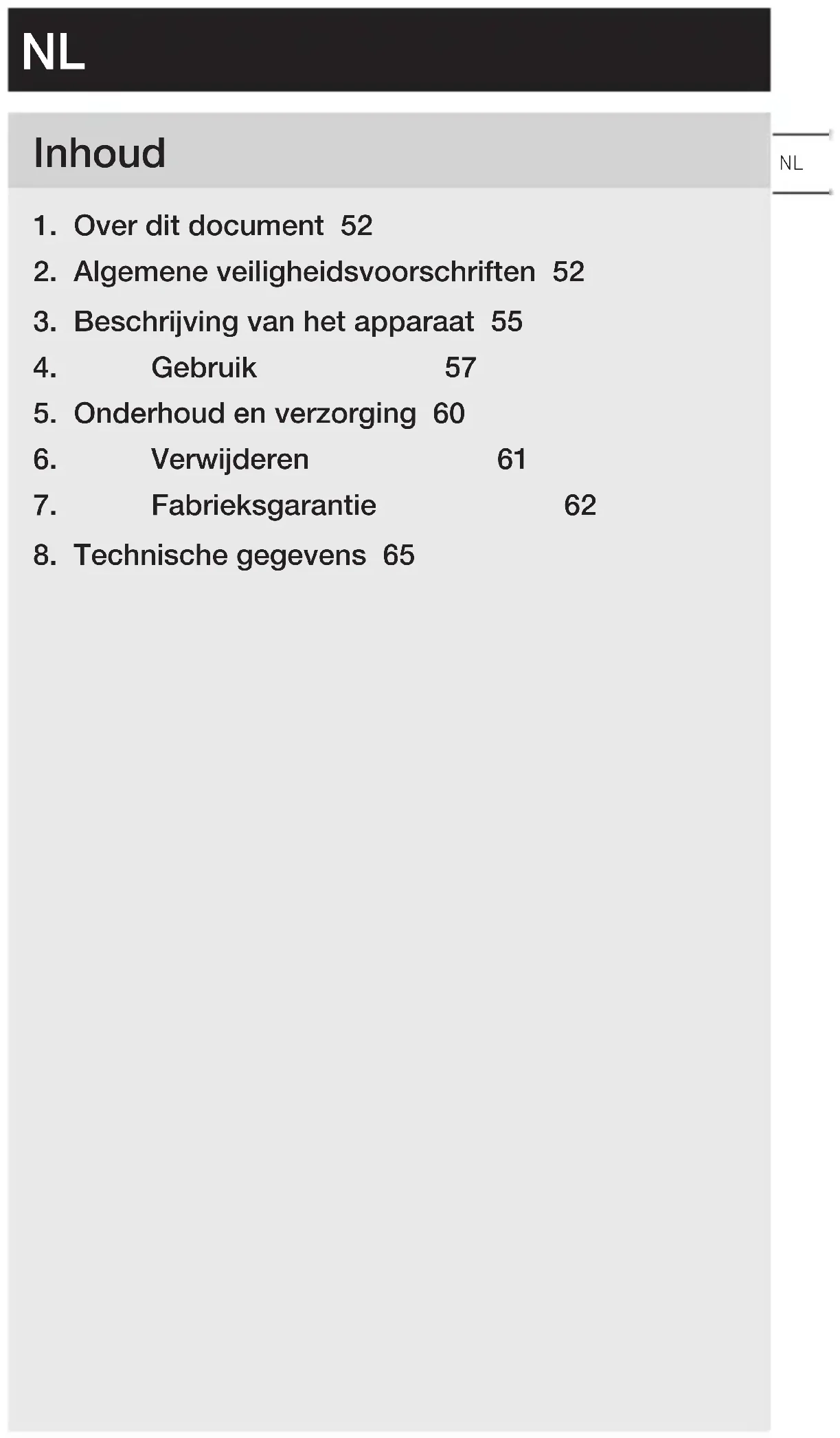 Dit apparaat is onderhoudsvrij. Het apparaat voldoet aan de relevante veiligheidsvoor- schriften. Reparaties mogen alleen worden uitgevoerd door een gekwalificeerde elektricien, anders bestaat er gevaar voor ongelukken. Onderhoud door de gebruiker. Eisen die aan de gebruiker worden gesteld: – Kennis van deze handleiding. Voor de volgende gebruikers gelden speciale eisen: – Kinderen vanaf 8 jaar. – Mensen met beperkte fysieke, zintuiglijke of psychische vaardigheden. – Mensen met een gebrek aan ervaring en kennis.NL – 61 – Inhoud Deze gebruikers mogen het apparaat alleen onderhouden. Speciale vereisten: – Gebruikers staan onder toezicht. – De gebruikers zijn geïnstrueerd over het veilige gebruik van het apparaat. – Gebruikers begrijpen de gevaren die bij het gebruiken van het apparaat ontstaan. – Laat kinderen niet met het apparaat spelen. Gevaar door elektrische stroom! Het contact van water met stroomvoerende componenten kan een elektrische schok, verbrandingen of zelfs de dood tot gevolg hebben.