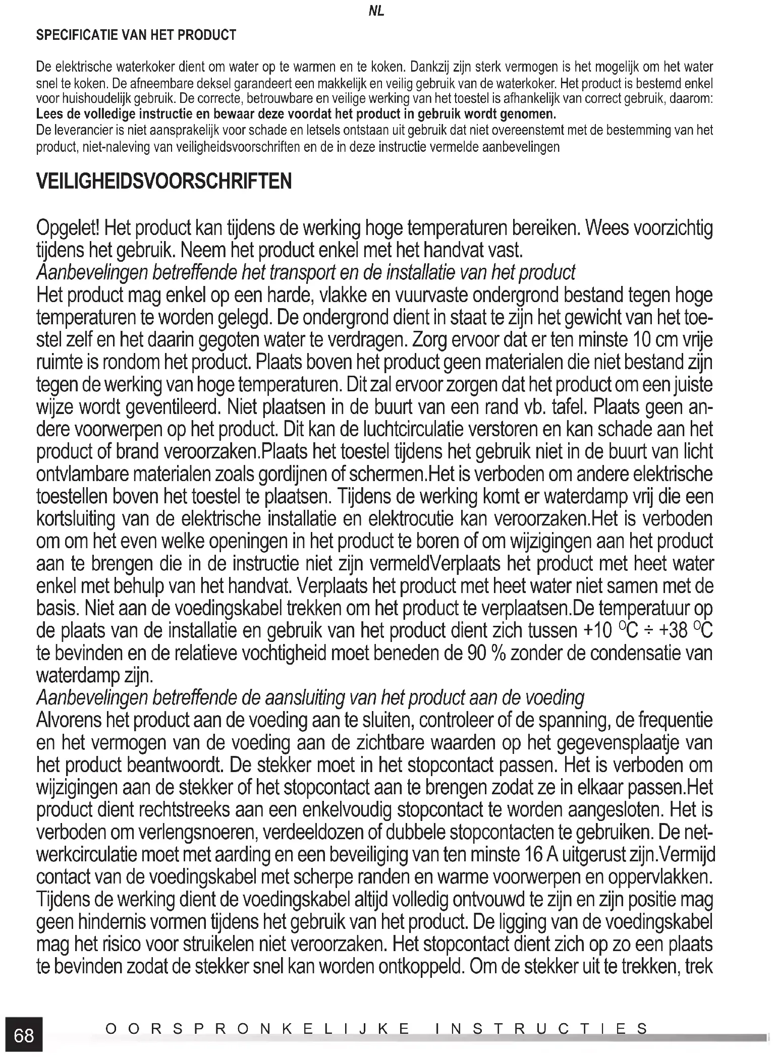 te bevinden en de relatieve vochtigheid moet beneden de 90 % zonder de condensatie van waterdamp zijn. Aanbevelingen betreff ende de aansluiting van het product aan de voeding Alvorens het product aan de voeding aan te sluiten, controleer of de spanning, de frequentie en het vermogen van de voeding aan de zichtbare waarden op het gegevensplaatje van het product beantwoordt. De stekker moet in het stopcontact passen. Het is verboden om wijzigingen aan de stekker of het stopcontact aan te brengen zodat ze in elkaar passen.Het product dient rechtstreeks aan een enkelvoudig stopcontact te worden aangesloten. Het is verboden om verlengsnoeren, verdeeldozen of dubbele stopcontacten te gebruiken. De net- werkcirculatie moet met aarding en een beveiliging van ten minste 16 A uitgerust zijn.Vermijd contact van de voedingskabel met scherpe randen en warme voorwerpen en oppervlakken. Tijdens de werking dient de voedingskabel altijd volledig ontvouwd te zijn en zijn positie mag geen hindernis vormen tijdens het gebruik van het product. De ligging van de voedingskabel mag het risico voor struikelen niet veroorzaken. Het stopcontact dient zich op zo een plaats te bevinden zodat de stekker snel kan worden ontkoppeld. Om de stekker uit te trekken, trek69 OORSPRONKELIJKE INSTRUCTIES