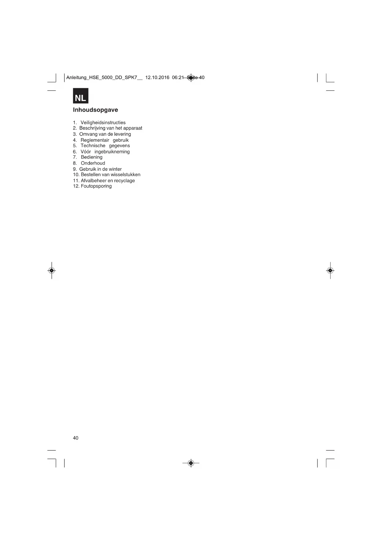 Het toestel bevindt zich in een verpakking om transportschade te voorkomen. Deze verpakking is een grondstof en bijgevolg herbruikbaar of kan de grondstofkringloop terug worden ingebracht. Het toestel en zijn accessoires bestaan uit diverse materialen, zoals b.v. metaal en kunststof. Ontdoet u zich van defecte onderdelen op de inzamelplaats waar u gevaarlijke afvalstoffen mag afgeven. Informeer u in uw speciaalzaak of bij uw gemeentebestuur! Anleitung_HSE_5000_DD_SPK7__ 12.10.2016 06:21 Seite 45NL
