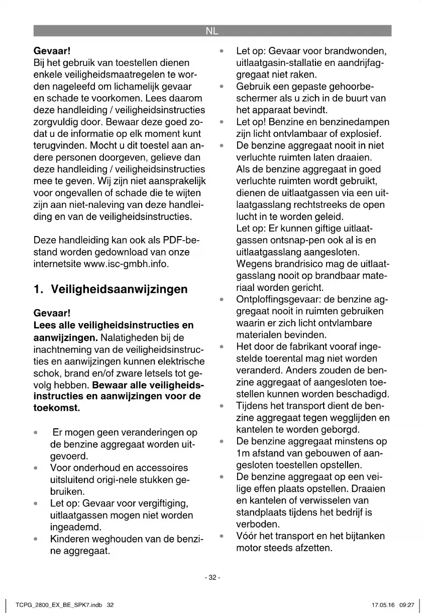 Gevaar! Bij het gebruik van toestellen dienen enkele veiligheidsmaatregelen te wor- den nageleefd om lichamelijk gevaar en schade te voorkomen. Lees daarom deze handleiding / veiligheidsinstructies zorgvuldig door. Bewaar deze goed zo- dat u de informatie op elk moment kunt terugvinden. Mocht u dit toestel aan an- dere personen doorgeven, gelieve dan deze handleiding / veiligheidsinstructies mee te geven. Wij zijn niet aansprakelijk voor ongevallen of schade die te wijten zijn aan niet-naleving van deze handlei- ding en van de veiligheidsinstructies. Deze handleiding kan ook als PDF-be- stand worden gedownload van onze internetsite www.isc-gmbh.info.