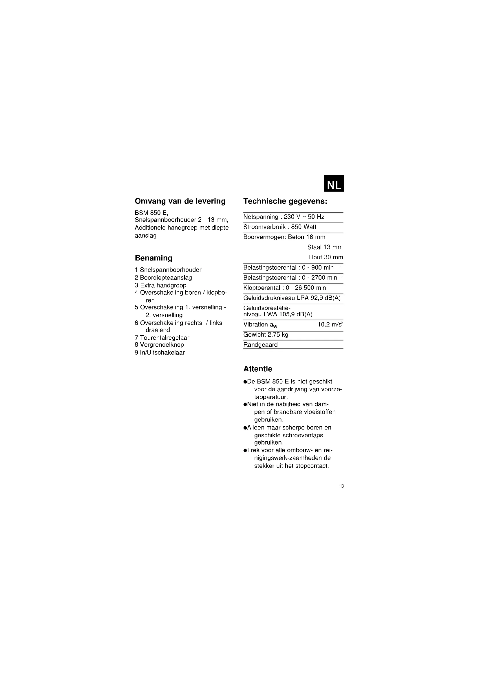 Gewicht 2,75 kg Randgeaard Attentie ● De BSM 850 E is niet geschikt voor de aandrijving van voorze- tapparatuur. ● Niet in de nabijheid van dam- pen of brandbare vloeistoffen gebruiken. ● Alleen maar scherpe boren en geschikte schroeventaps gebruiken. ● Trek voor alle ombouw- en rei- nigingswerk-zaamheden de stekker uit het stopcontact.14