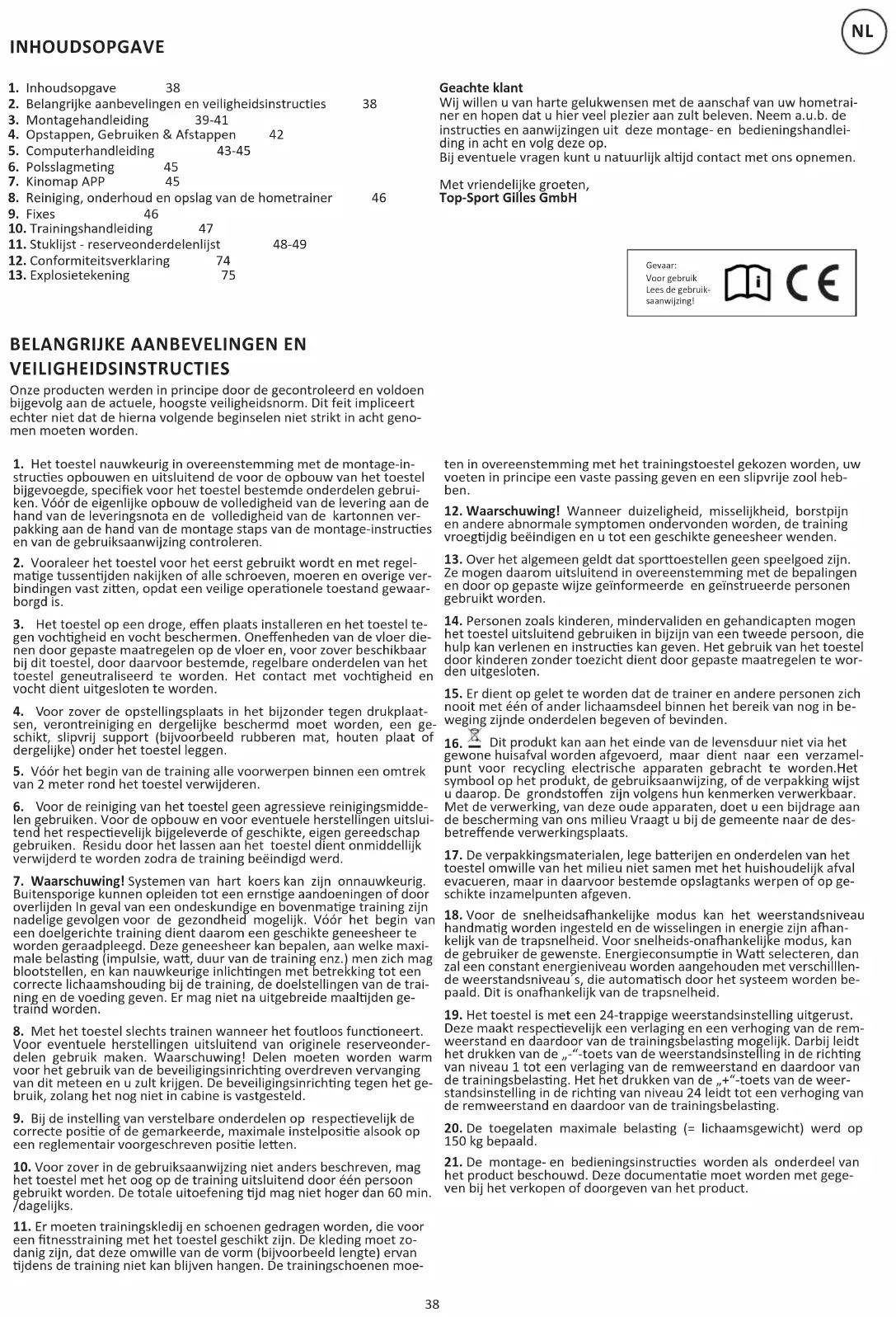 VEILIGHEIDSINSTRUCTIES Geachte klant Wij willen u van harte gelukwensen met de aanschaf van uw hometrai- ner en hopen dat u hier veel plezier aan zult beleven. Neem a.u.b. de instruces en aanwijzingen uit deze montage- en bedieningshandlei- ding in acht en volg deze op. Bij eventuele vragen kunt u natuurlijk aljd contact met ons opnemen. Met vriendelijke groeten, Top-Sport Gilles GmbH Onze producten werden in principe door de gecontroleerd en voldoen bijgevolg aan de actuele, hoogste veiligheidsnorm. Dit feit impliceert echter niet dat de hierna volgende beginselen niet strikt in acht geno- men moeten worden.