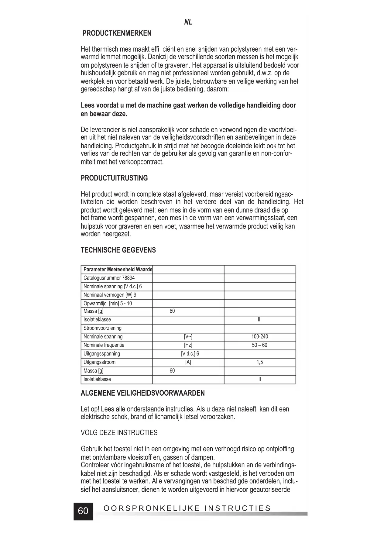 PRODUCTKENMERKEN Het thermisch mes maakt effi ciënt en snel snijden van polystyreen met een ver- warmd lemmet mogelijk. Dankzij de verschillende soorten messen is het mogelijk om polystyreen te snijden of te graveren. Het apparaat is uitsluitend bedoeld voor huishoudelijk gebruik en mag niet professioneel worden gebruikt, d.w.z. op de werkplek en voor betaald werk. De juiste, betrouwbare en veilige werking van het gereedschap hangt af van de juiste bediening, daarom: Lees voordat u met de machine gaat werken de volledige handleiding door en bewaar deze. De leverancier is niet aansprakelijk voor schade en verwondingen die voortvloei- en uit het niet naleven van de veiligheidsvoorschriften en aanbevelingen in deze handleiding. Productgebruik in strijd met het beoogde doeleinde leidt ook tot het verlies van de rechten van de gebruiker als gevolg van garantie en non-confor- miteit met het verkoopcontract. PRODUCTUITRUSTING Het product wordt in complete staat afgeleverd, maar vereist voorbereidingsac- tiviteiten die worden beschreven in het verdere deel van de handleiding. Het product wordt geleverd met: een mes in de vorm van een dunne draad die op het frame wordt gespannen, een mes in de vorm van een verwarmingsstaaf, een hulpstuk voor graveren en een voet, waarmee het verwarmde product veilig kan worden neergezet. TECHNISCHE GEGEVENS Parameter Meeteenheid Waarde Catalogusnummer 78894 Nominale spanning [V d.c.] 6 Nominaal vermogen [W] 9 Opwarmtijd [min] 5 - 10 Massa [g] 60 Isolatieklasse III Stroomvoorziening Nominale spanning [V~] 100-240 Nominale frequentie [Hz] 50 – 60 Uitgangsspanning [V d.c.] 6 Uitgangsstroom [A] 1,5 Massa [g] 60 Isolatieklasse II ALGEMENE VEILIGHEIDSVOORWAARDEN Let op! Lees alle onderstaande instructies. Als u deze niet naleeft, kan dit een elektrische schok, brand of lichamelijk letsel veroorzaken.