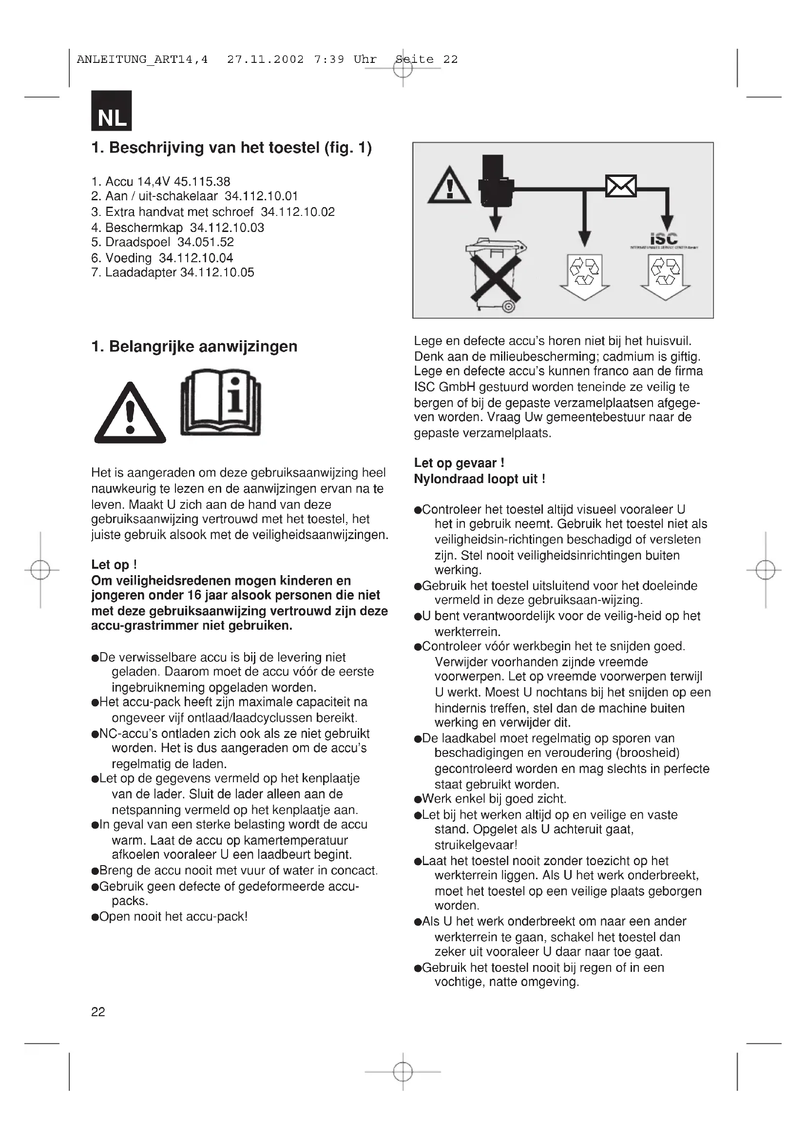 1. Beschrijving van het toestel (fig. 1)1. Accu 14,4V 45.115.382. Aan / uit-schakelaar 34.112.10.013. Extra handvat met schroef 34.112.10.024. Beschermkap 34.112.10.035. Draadspoel 34.051.526. Voeding 34.112.10.047. Laadadapter 34.112.10.051. Belangrijke aanwijzingen Het is aangeraden om deze gebruiksaanwijzing heelnauwkeurig te lezen en de aanwijzingen ervan na televen. Maakt U zich aan de hand van dezegebruiksaanwijzing vertrouwd met het toestel, hetjuiste gebruik alsook met de veiligheidsaanwijzingen.Let op !Om veiligheidsredenen mogen kinderen enjongeren onder 16 jaar alsook personen die nietmet deze gebruiksaanwijzing vertrouwd zijn dezeaccu-grastrimmer niet gebruiken. De verwisselbare accu is bij de levering niet geladen. Daarom moet de accu vóór de eerste ingebruikneming opgeladen worden. Het accu-pack heeft zijn maximale capaciteit na ongeveer vijf ontlaad/laadcyclussen bereikt. NC-accu’s ontladen zich ook als ze niet gebruikt worden. Het is dus aangeraden om de accu’s regelmatig de laden. Let op de gegevens vermeld op het kenplaatje van de lader. Sluit de lader alleen aan de netspanning vermeld op het kenplaatje aan. In geval van een sterke belasting wordt de accu warm. Laat de accu op kamertemperatuur afkoelen vooraleer U een laadbeurt begint. Breng de accu nooit met vuur of water in concact. Gebruik geen defecte of gedeformeerde accu-packs. Open nooit het accu-pack!Lege en defecte accu’s horen niet bij het huisvuil.Denk aan de milieubescherming; cadmium is giftig.Lege en defecte accu’s kunnen franco aan de firmaISC GmbH gestuurd worden teneinde ze veilig tebergen of bij de gepaste verzamelplaatsen afgege-ven worden. Vraag Uw gemeentebestuur naar degepaste verzamelplaats.Let op gevaar !Nylondraad loopt uit ! Controleer het toestel altijd visueel vooraleer U het in gebruik neemt. Gebruik het toestel niet als veiligheidsin-richtingen beschadigd of versleten zijn. Stel nooit veiligheidsinrichtingen buiten werking. Gebruik het toestel uitsluitend voor het doeleinde vermeld in deze gebruiksaan-wijzing. U bent verantwoordelijk voor de veilig-heid op hetwerkterrein. Controleer vóór werkbegin het te snijden goed. Verwijder voorhanden zijnde vreemde voorwerpen. Let op vreemde voorwerpen terwijl U werkt. Moest U nochtans bij het snijden op eenhindernis treffen, stel dan de machine buiten werking en verwijder dit. De laadkabel moet regelmatig op sporen van beschadigingen en veroudering (broosheid) gecontroleerd worden en mag slechts in perfecte staat gebruikt worden. Werk enkel bij goed zicht. Let bij het werken altijd op en veilige en vaste stand. Opgelet als U achteruit gaat, struikelgevaar! Laat het toestel nooit zonder toezicht op het werkterrein liggen. Als U het werk onderbreekt, moet het toestel op een veilige plaats geborgen worden. Als U het werk onderbreekt om naar een ander werkterrein te gaan, schakel het toestel dan zeker uit vooraleer U daar naar toe gaat. Gebruik het toestel nooit bij regen of in een vochtige, natte omgeving.