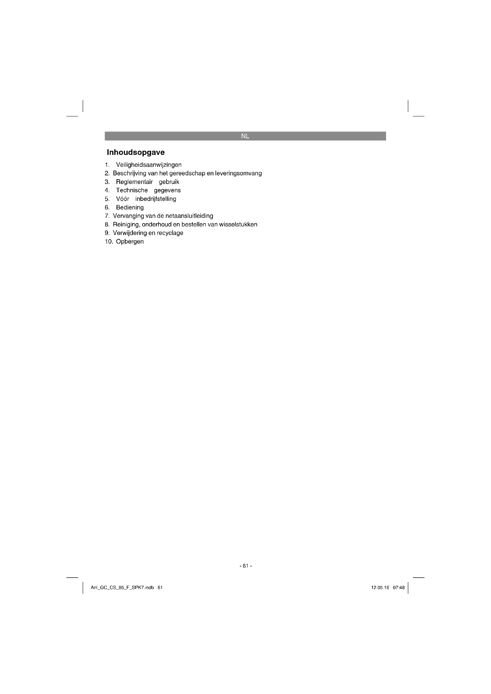 Enkel voor EU-landen Elektrisch gereedschap hoort niet bij het huisvuil thuis! Volgens de Europese richtlijn 2012/19/EG op afgedankte elektrische en elektronische toestellen en omzetting in nationaal recht dienen afgedankte elektrische gereedschappen afzonderlijk te worden ver- zameld en milieuvriendelijk te worden gerecycleerd. Recyclagealternatief i.p.v. het toestel terug te sturen: De eigenaar van het elektrische toestel is alternatief verplicht, i.p.v. het toestel terug te sturen, mede te werken bij de behoorlijke recyclage in geval hij zich van het eigendom ontdoet. Het afgedankte toestel kan hiervoor ook bij een verzamelplaats worden afgegeven die voor een verwijdering als bedoeld in de wetgeving in zake recyclage en afvalverwerking zorgt. Hieronder vallen niet bij de afgedankte toestellen gevoegde accessoires en hulpmiddelen zonder elektrische componenten. Nadruk of andere reproductie van documentatie en geleidepapieren van de producten, geheel of ge- deeltelijk, enkel toegestaan mits uitdrukkelijke toestemming van iSC GmbH. Technische wijzigingen voorbehouden Anl_GC_CS_85_F_SPK7.indb 67Anl_GC_CS_85_F_SPK7.indb 67 12.05.16 07:4812.05.16 07:48NL