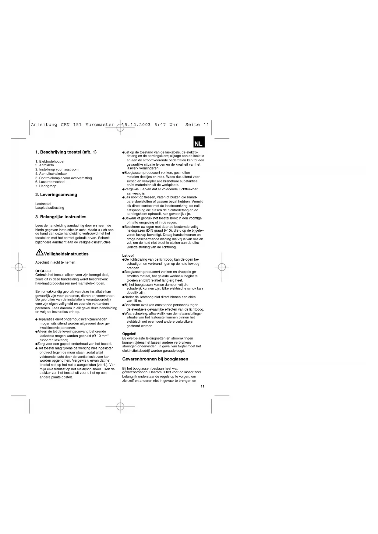 rubberen laskabel). Zorg voor een gepast onderhoud van het toestel. Het toestel mag tijdens de werking niet ingesloten of direct tegen de muur staan, zodat altijd voldoende lucht door de ventilatiesleuven kan worden opgenomen. Vergewis u ervan dat het toestel niet op het net is aangesloten (zie 4.). Ver- mijd elke treklast op het elektrisch snoer. Trek de stekker van het toestel uit voor u het op een andere plaats opstelt. Let op de toestand van de laskabels, de elektro- detang en de aardingsklem; slijtage aan de isolatie en aan de stroomvoerende onderdelen kan tot een gevaarlijke situatie leiden en de kwaliteit van het laswerk verminderen. Booglassen produceert vonken, gesmolten metalen deeltjes en rook. Wees dus uiterst voor- zichtig en verwijder alle brandbare substanties en/of materialen uit de werkplaats. Vergewis u ervan dat er voldoende luchttoevoer aanwezig is. Las nooit op flessen, vaten of buizen die brand- bare vloeistoffen of gassen bevat hebben. Vermijd elk direct contact met de lasstroomkring; de null- astspanning die tussen de elektrodetang en de aardingsklem optreedt, kan gevaarlijk zijn. Bewaar of gebruik het toestel nooit in een vochtige of natte omgeving of in de regen. Bescherm uw ogen met daartoe bestemde veilig- heidsglazen (DIN graad 9-10), die u op de bijgele-- verde laskap bevestigt. Draag handschoenen en droge beschermende kleding die vrij is van olie en vet, om de huid niet bloot te stellen aan de ultra- violette straling van de lichtboog. Let op! De lichtstraling van de lichtboog kan de ogen be- schadigen en verbrandingen op de huid teweeg- brengen. Booglassen produceert vonken en druppels ge- smolten metaal, het gelaste werkstuk begint te gloeien en blijft relatief lang erg heet. Bij het booglassen komen dampen vrij die schadelijk kunnen zijn. Elke elektrische schok kan dodelijk zijn. Nader de lichtboog niet direct binnen een cirkel van 15 m. Bescherm uzelf (en omstaande personen) tegen de eventuele gevaarlijke effecten van de lichtboog. Waarschuwing: afhankelijk van de netaansluitings- situatie van het lastoestel kunnen binnen het elektrisch net eventueel andere verbruikers gestoord worden. Opgelet! Bij overbelaste leidingnetten en stroomkringen kunnen tijdens het lassen andere verbruikers storingen ondervinden. In geval van twijfel moet het elektriciteitsbedrijf worden geraadpleegd. Gevarenbronnen bij booglassen Bij het booglassen bestaan heel wat gevarenbronnen. Daarom is het voor de lasser zeer belangrijk onderstaande regels op te volgen, om zichzelf en anderen niet in gevaar te brengen en