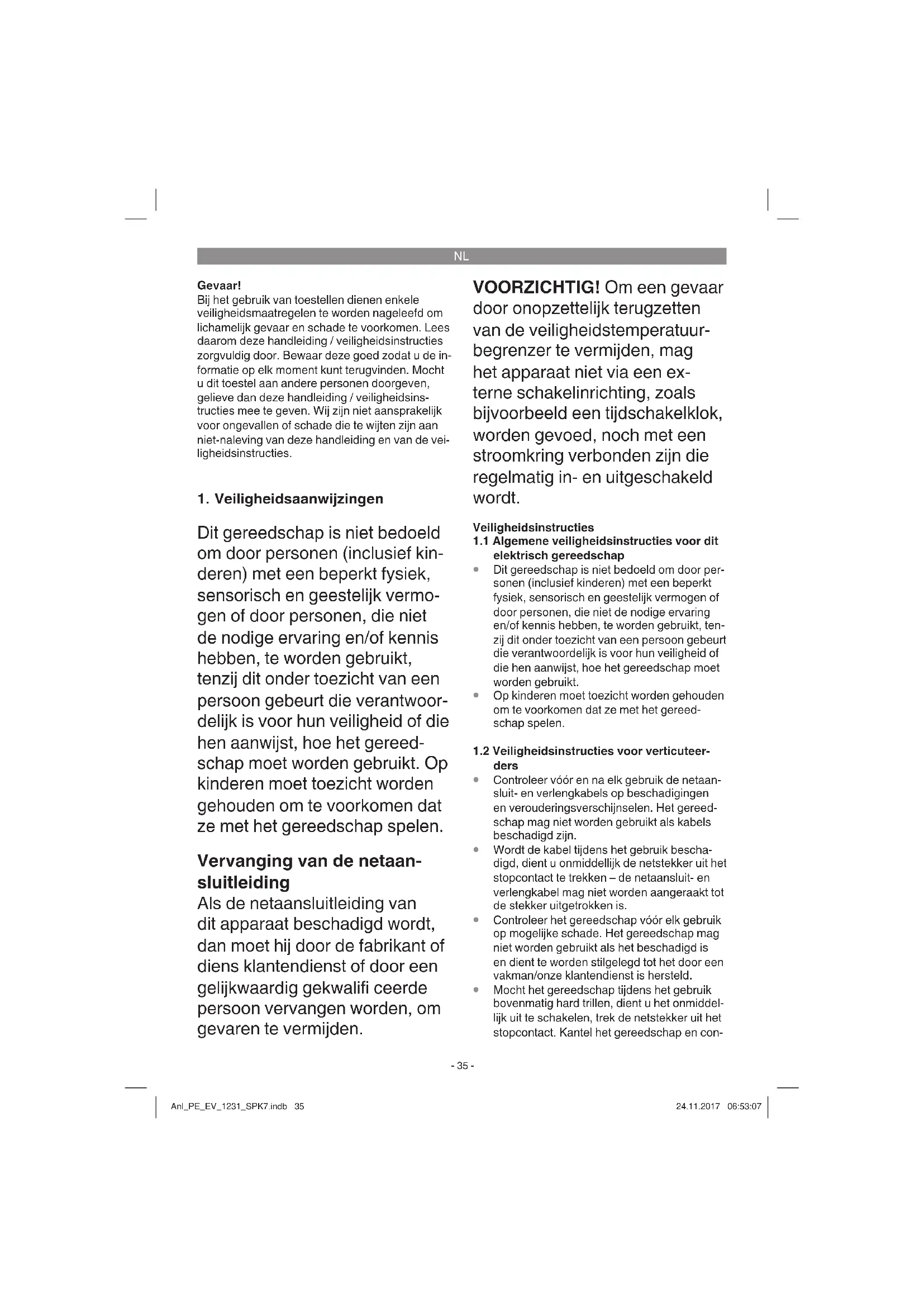 Dit gereedschap is niet bedoeld om door personen (inclusief kin- deren) met een beperkt fysiek, sensorisch en geestelijk vermo- gen of door personen, die niet de nodige ervaring en/of kennis hebben, te worden gebruikt, tenzij dit onder toezicht van een persoon gebeurt die verantwoor- delijk is voor hun veiligheid of die hen aanwijst, hoe het gereed- schap moet worden gebruikt. Op kinderen moet toezicht worden gehouden om te voorkomen dat ze met het gereedschap spelen. Vervanging van de netaan- sluitleiding Als de netaansluitleiding van dit apparaat beschadigd wordt, dan moet hij door de fabrikant of diens klantendienst of door een gelijkwaardig gekwalifi ceerde persoon vervangen worden, om gevaren te vermijden. VOORZICHTIG! Om een gevaar door onopzettelijk terugzetten van de veiligheidstemperatuur- begrenzer te vermijden, mag het apparaat niet via een ex- terne schakelinrichting, zoals bijvoorbeeld een tijdschakelklok, worden gevoed, noch met een stroomkring verbonden zijn die regelmatig in- en uitgeschakeld wordt. Veiligheidsinstructies