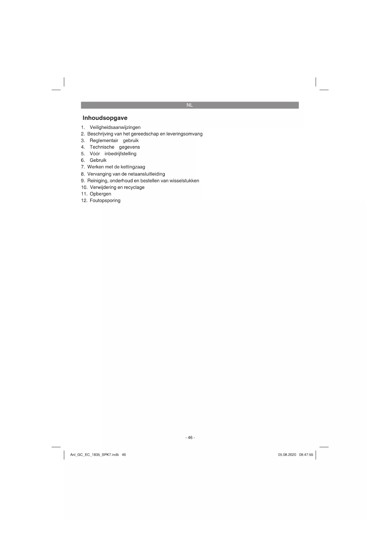 Controleer of de gegevens vermeld op het ken- plaatje overeenkomen met de gegevens van het stroomnet alvorens het gereedschap aan te sluiten. Waarschuwing! Verwijder altijd de netstekker uit het stop- contact voordat u het gereedschap anders afstelt. Sluit de kettingzaag pas aan op het stroomnet als deze volledig is gemonteerd en de kettingspan- ning is ingesteld. Draag altijd veiligheidshand- schoenen als u werkzaamheden op de ketting- zaag verricht om letsel te voorkomen. Anl_GC_EC_1835_SPK7.indb 48Anl_GC_EC_1835_SPK7.indb 48 05.08.2020 08:47:5605.08.2020 08:47:56NL