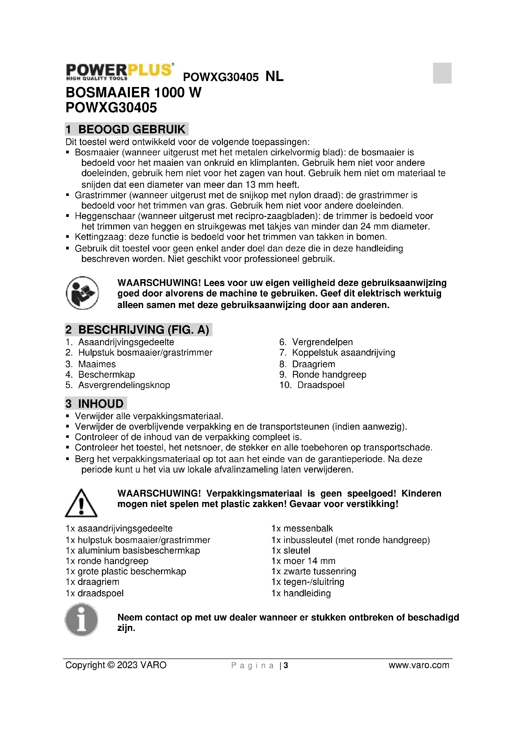 - Berg het verpakkingsmateriaal op tot aan het einde van de garantieperiode. Na deze periode kunt u het via uw lokale afvalinzameling laten verwijderen. WAARSCHUWING! Verpakkingsmateriaal is geen speelgoed! Kinderen mogen niet spelen met plastic zakken! Gevaar voor verstikking! 1x asaandrijvingsgedeelte 1x hulpstuk bosmaaier/grastrimmer 1x aluminium basisbeschermkap 1x ronde handgreep 1x grote plastic beschermkap 1x draagriem 1x draadspoel 1x messenbalk 1x inbussleutel (met ronde handgreep) 1x sleutel 1x moer 14 mm 1x zwarte tussenring 1x tegen-/sluitring 1x handleiding Neem contact op met uw dealer wanneer er stukken ontbreken of beschadigd zijn.POWXG30405 NL Copyright © 2023 VARO P a g i n a | 4 www.varo.com