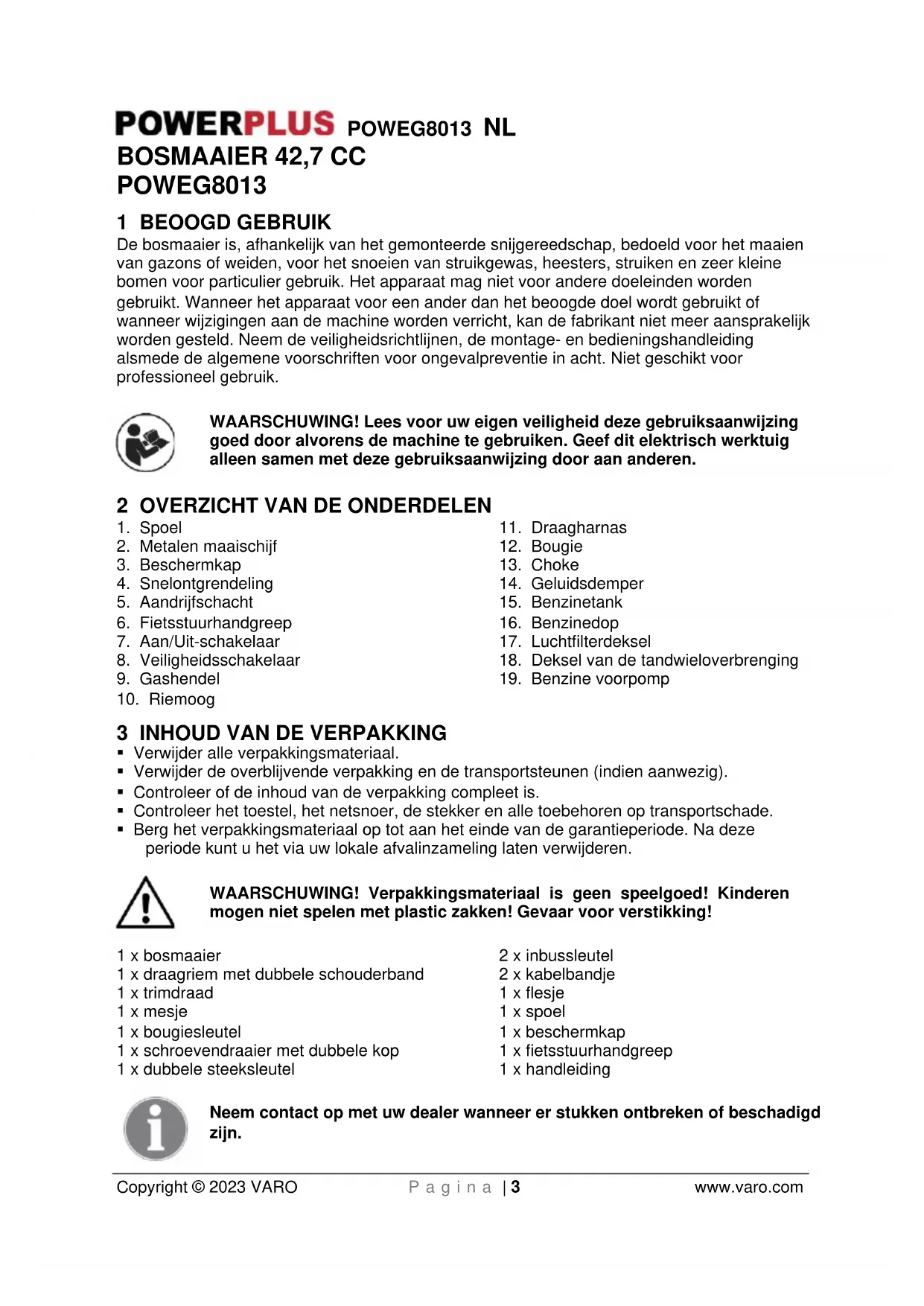 - Berg het verpakkingsmateriaal op tot aan het einde van de garantieperiode. Na deze periode kunt u het via uw lokale afvalinzameling laten verwijderen. WAARSCHUWING! Verpakkingsmateriaal is geen speelgoed! Kinderen mogen niet spelen met plastic zakken! Gevaar voor verstikking! 1 x bosmaaier 1 x draagriem met dubbele schouderband 1 x trimdraad 1 x mesje 1 x bougiesleutel 1 x schroevendraaier met dubbele kop 1 x dubbele steeksleutel 2 x inbussleutel 2 x kabelbandje 1 x flesje 1 x spoel 1 x beschermkap 1 x fietsstuurhandgreep 1 x handleiding Neem contact op met uw dealer wanneer er stukken ontbreken of beschadigd zijn.POWEG8013 NL Copyright © 2023 VARO P a g i n a | 4 www.varo.com