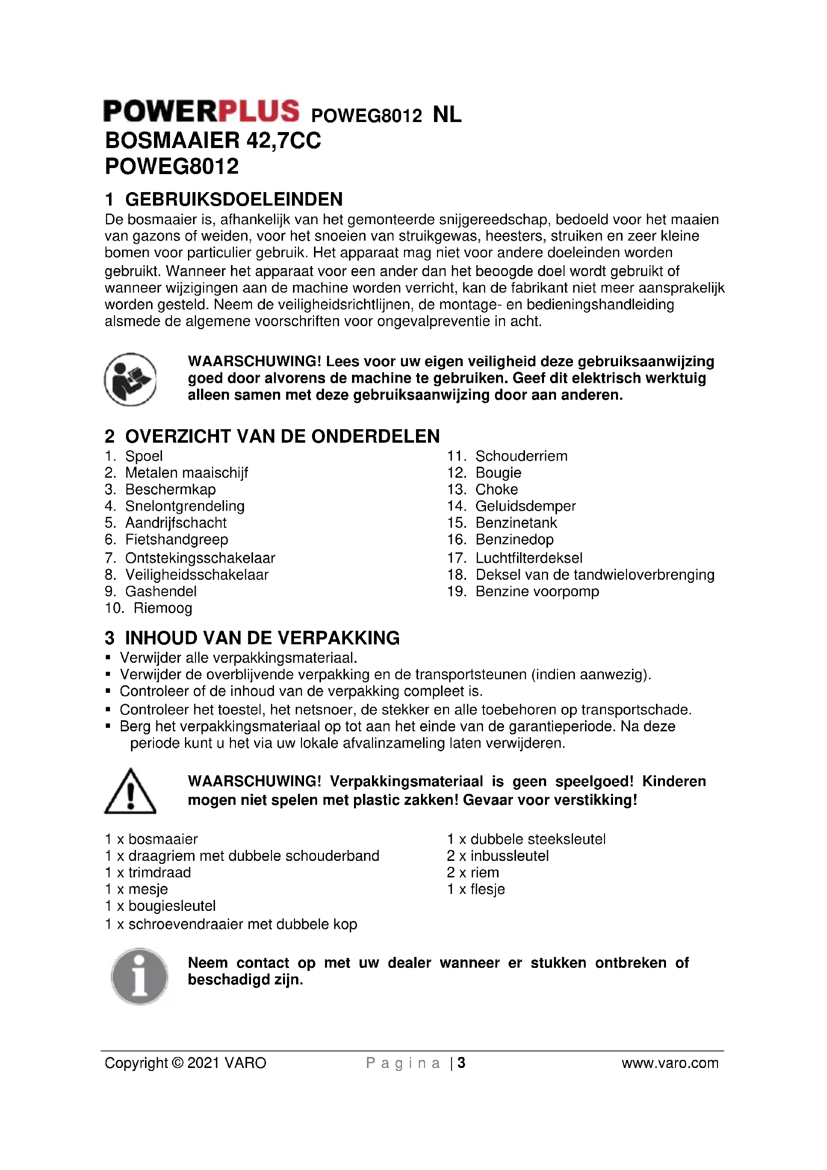 - Berg het verpakkingsmateriaal op tot aan het einde van de garantieperiode. Na deze periode kunt u het via uw lokale afvalinzameling laten verwijderen. WAARSCHUWING! Verpakkingsmateriaal is geen speelgoed! Kinderen mogen niet spelen met plastic zakken! Gevaar voor verstikking! 1 x bosmaaier 1 x draagriem met dubbele schouderband 1 x trimdraad 1 x mesje 1 x bougiesleutel 1 x schroevendraaier met dubbele kop 1 x dubbele steeksleutel 2 x inbussleutel 2 x riem 1 x flesje Neem contact op met uw dealer wanneer er stukken ontbreken of beschadigd zijn.POWEG8012 NL Copyright © 2021 VARO P a g i n a | 4 www.varo.com