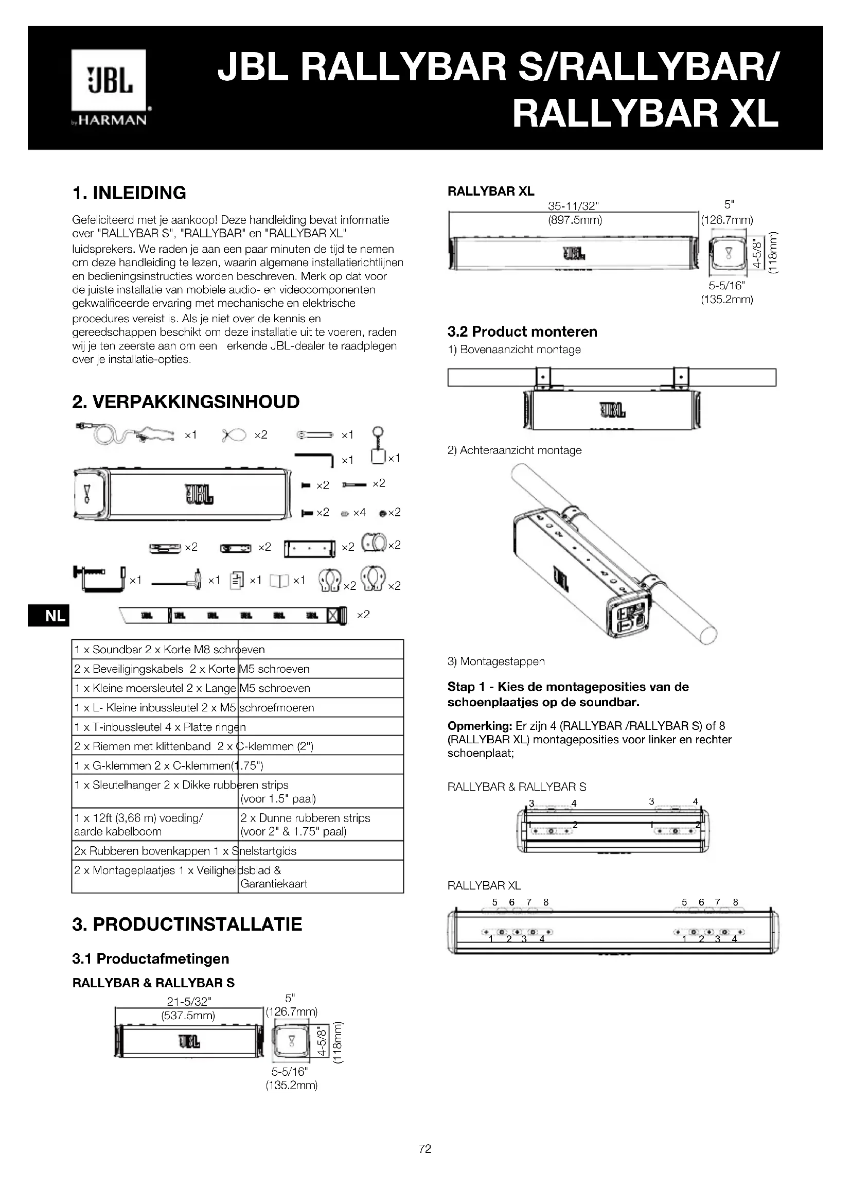 Gefeliciteerd met je aankoop! Deze handleiding bevat informatie over "RALLYBAR S", "RALLYBAR" en "RALLYBAR XL" luidsprekers. We raden je aan een paar minuten de tijd te nemen om deze handleiding te lezen, waarin algemene installatierichtlijnen en bedieningsinstructies worden beschreven. Merk op dat voor de juiste installatie van mobiele audio- en videocomponenten gekwalificeerde ervaring met mechanische en elektrische procedures vereist is. Als je niet over de kennis en gereedschappen beschikt om deze installatie uit te voeren, raden wij je ten zeerste aan om een erkende JBL-dealer te raadplegen over je installatie-opties.