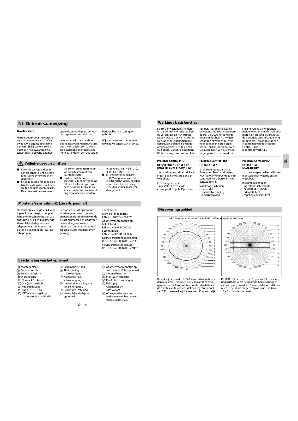 L Voor alle werkzaamheden aan de sensor dient de span- ningstoevoer te worden on- derbroken! L Bij de montage moet de elek- trische leiding die u wilt aan- sluiten zonder spanning zijn. Daarom eerst de stroom uit- schakelen en op spannings- loosheid testen met een spanningstester. L Bij de installatie van de sen- sor werkt u met netspanning. Dit moet vakkundig en vol- gens de gebruikelijke instal- latievoorschriften en aanslui- tingsvoorwaarden worden uitgevoerd. (NL: NEN 1010, B: (AREI) NBN 15-101) L Bij de regeluitgang DIM 1-10 V mogen uitsluitend elektronische voorschakelap- paraten met potentiaalge- scheiden stuursignaal wor- den gebruikt. Beschrijving van het apparaat a Montageplaat b Sensormodule c Sensoronderkant d Dipschakelaar (1) Normaal-/testmodus (2) (Half)automatisch (3) Knop/schakelaar (4) Knop ON / ON-OFF (5) DIM-variant regeling constant licht ON/OFF e Schemerinstelling f Tijdinstelling schakeluitgang 1 g Nalooptijd HLK schakeluitgang 2 h Inschakelvertraging HLK schakeluitgang 2 i Reikwijdte-instelling j Klem-plafondadapter, optioneel k Adapter voor montage op het plafond IP 54, optioneel l Sluitmechanisme m Montage/installatie n Parallelle schakelingen o Nalooptijd Oriëntatielicht DIM-variant p Afdekplaatjes voor het verkleinen van het registra- tiebereik (HF 360). Montage/aansluiting m (zie afb. pagina 2) De sensor is alleen geschikt voor inpandige montage in het pla- fond (met uitzondering van vari- ant COM 1 AP). Een bijpassende klem-plafondadapter en een adapter voor montage op het plafond zijn niet bij de levering inbegrepen. Sensor- en belastingsmodule worden gemonteerd geleverd en moeten na inbouwen van de belastingsmodule en uitgevoer- de instellingswerkzaam- heden aan de potentiometers/ dipschakelaars worden samen- gevoegd. Toebehoren: Klem-plafondadapter, EAN-nr.: 4007841 000370 Adapter voor montage op het plafond, EAN-nr.: 4007841 000363 Beschermkap, EAN-nr.: 4007841 003036 Gebruikersafstandsbediening RC 5, EAN-nr.: 4007841 592806 Serviceafstandsbediening RC 8, EAN-nr.: 4007841 559410 NL Gebruiksaanwijzing Geachte klant, Hartelijk dank voor het vertrou- wen dat u met de aanschaf van uw nieuwe aanwezigheidsmel- der van STEINEL in ons stelt. U heeft een hoogwaardig kwali- teitsproduct gekocht, dat met uiterste zorgvuldigheid vervaar- digd, getest en verpakt werd. Lees voor de installatie deze gebruiksaanwijzing nauwkeurig door, want alleen een vakkun- dige installatie en ingebruikne- ming garanderen een duurzaam, betrouwbaar en storingvrij gebruik. Wij wensen u veel plezier met uw nieuwe sensor van STEINEL. Veiligheidsvoorschriften Werking / basisfuncties De HF-aanwezigheidsmelders uit de Control Pro serie regelen de verlichting en HLK-sturing (alleen COM 2), bijv. in kantoren, wc's, openbare of particuliere gebouwen, afhankelijk van de omgevingslichtsterkte en aan- wezigheid. Dankzij de moderne HF-technologie is een complete, temperatuuronafhankelijke bewegingsregistratie gegaran- deerd. De DUAL HF-sensor is door zijn dubbele richteigen- schappen bijzonder geschikt voor gangen in hotels en in school- en kantoorgebouwen. De instellingen van de schakel- uitgangen en de reikwijdte-in- stelling van de aanwezigheids- melder worden met de potentio- meters en dipschakelaars, resp. de optionele afstandsbediening uitgevoerd. Een andere goede eigenschap van de Presence- Control is zijn lage stroomverbruik. Presence Control PRO