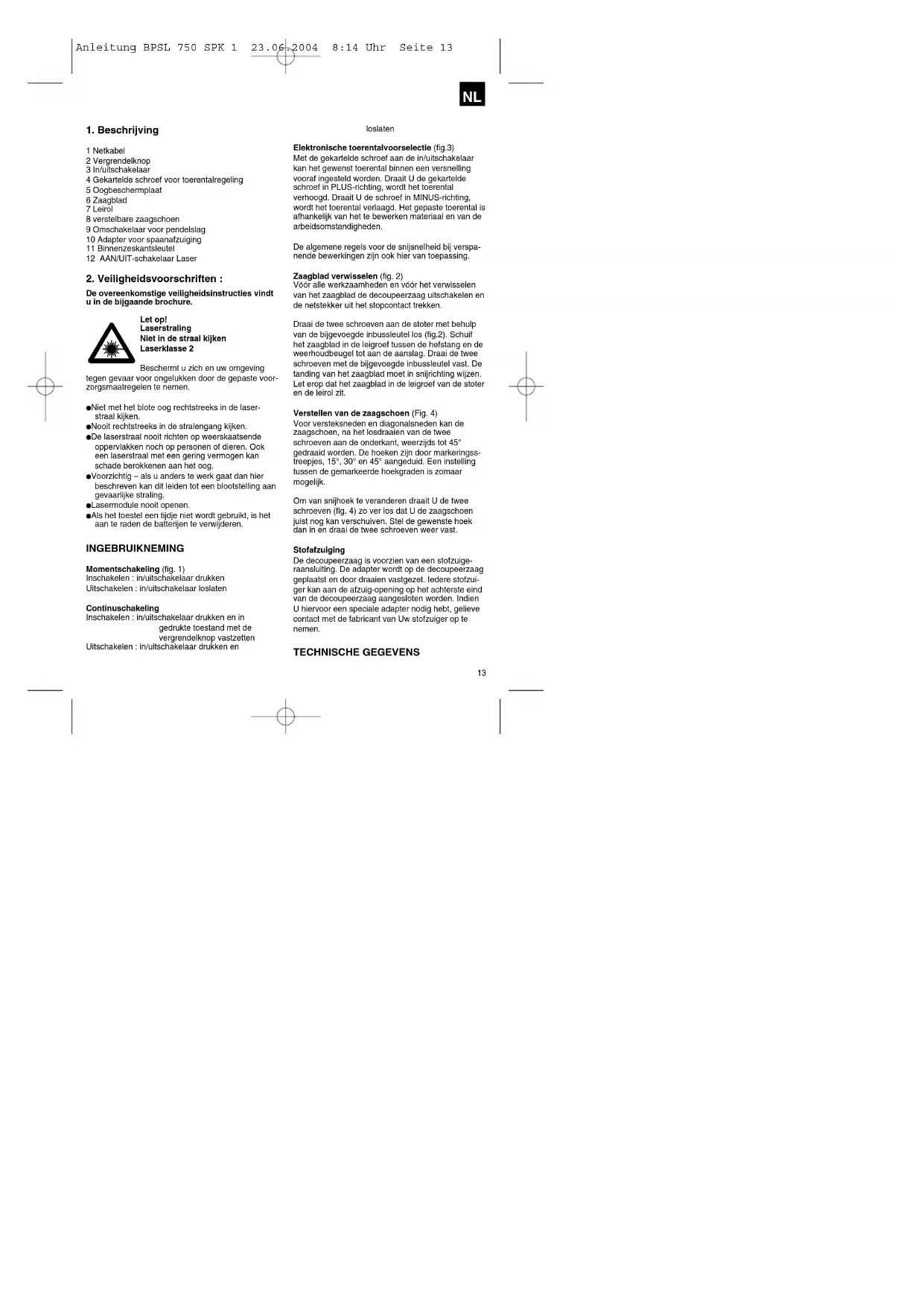 De overeenkomstige veiligheidsinstructies vindt u in de bijgaande brochure. Let op! Laserstraling Niet in de straal kijken Laserklasse 2 Beschermt u zich en uw omgeving tegen gevaar voor ongelukken door de gepaste voor- zorgsmaatregelen te nemen. Niet met het blote oog rechtstreeks in de laser- straal kijken. Nooit rechtstreeks in de stralengang kijken. De laserstraal nooit richten op weerskaatsende oppervlakken noch op personen of dieren. Ook een laserstraal met een gering vermogen kan schade berokkenen aan het oog. Voorzichtig – als u anders te werk gaat dan hier beschreven kan dit leiden tot een blootstelling aan gevaarlijke straling. Lasermodule nooit openen. Als het toestel een tijdje niet wordt gebruikt, is het aan te raden de batterijen te verwijderen. INGEBRUIKNEMING Momentschakeling (fig. 1) Inschakelen : in/uitschakelaar drukken Uitschakelen : in/uitschakelaar loslaten Continuschakeling Inschakelen : in/uitschakelaar drukken en in gedrukte toestand met de vergrendelknop vastzetten Uitschakelen : in/uitschakelaar drukken en loslaten Elektronische toerentalvoorselectie (fig.3) Met de gekartelde schroef aan de in/uitschakelaar kan het gewenst toerental binnen een versnelling vooraf ingesteld worden. Draait U de gekartelde schroef in PLUS-richting, wordt het toerental verhoogd. Draait U de schroef in MINUS-richting, wordt het toerental verlaagd. Het gepaste toerental is afhankelijk van het te bewerken materiaal en van de arbeidsomstandigheden. De algemene regels voor de snijsnelheid bij verspa- nende bewerkingen zijn ook hier van toepassing. Zaagblad verwisselen (fig. 2) Vóór alle werkzaamheden en vóór het verwisselen van het zaagblad de decoupeerzaag uitschakelen en de netstekker uit het stopcontact trekken. Draai de twee schroeven aan de stoter met behulp van de bijgevoegde inbussleutel los (fig.2). Schuif het zaagblad in de leigroef tussen de hefstang en de weerhoudbeugel tot aan de aanslag. Draai de twee schroeven met de bijgevoegde inbussleutel vast. De tanding van het zaagblad moet in snijrichting wijzen. Let erop dat het zaagblad in de leigroef van de stoter en de leirol zit. Verstellen van de zaagschoen (Fig. 4) Voor versteksneden en diagonalsneden kan de zaagschoen, na het losdraaien van de twee schroeven aan de onderkant, weerzijds tot 45° gedraaid worden. De hoeken zijn door markeringss- treepjes, 15°, 30° en 45° aangeduid. Een instelling tussen de gemarkeerde hoekgraden is zomaar mogelijk. Om van snijhoek te veranderen draait U de twee schroeven (fig. 4) zo ver los dat U de zaagschoen juist nog kan verschuiven. Stel de gewenste hoek dan in en draai de twee schroeven weer vast. Stofafzuiging De decoupeerzaag is voorzien van een stofzuige- raansluiting. De adapter wordt op de decoupeerzaag geplaatst en door draaien vastgezet. Iedere stofzui- ger kan aan de afzuig-opening op het achterste eind van de decoupeerzaag aangesloten worden. Indien U hiervoor een speciale adapter nodig hebt, gelieve contact met de fabricant van Uw stofzuiger op te nemen. TECHNISCHE GEGEVENS