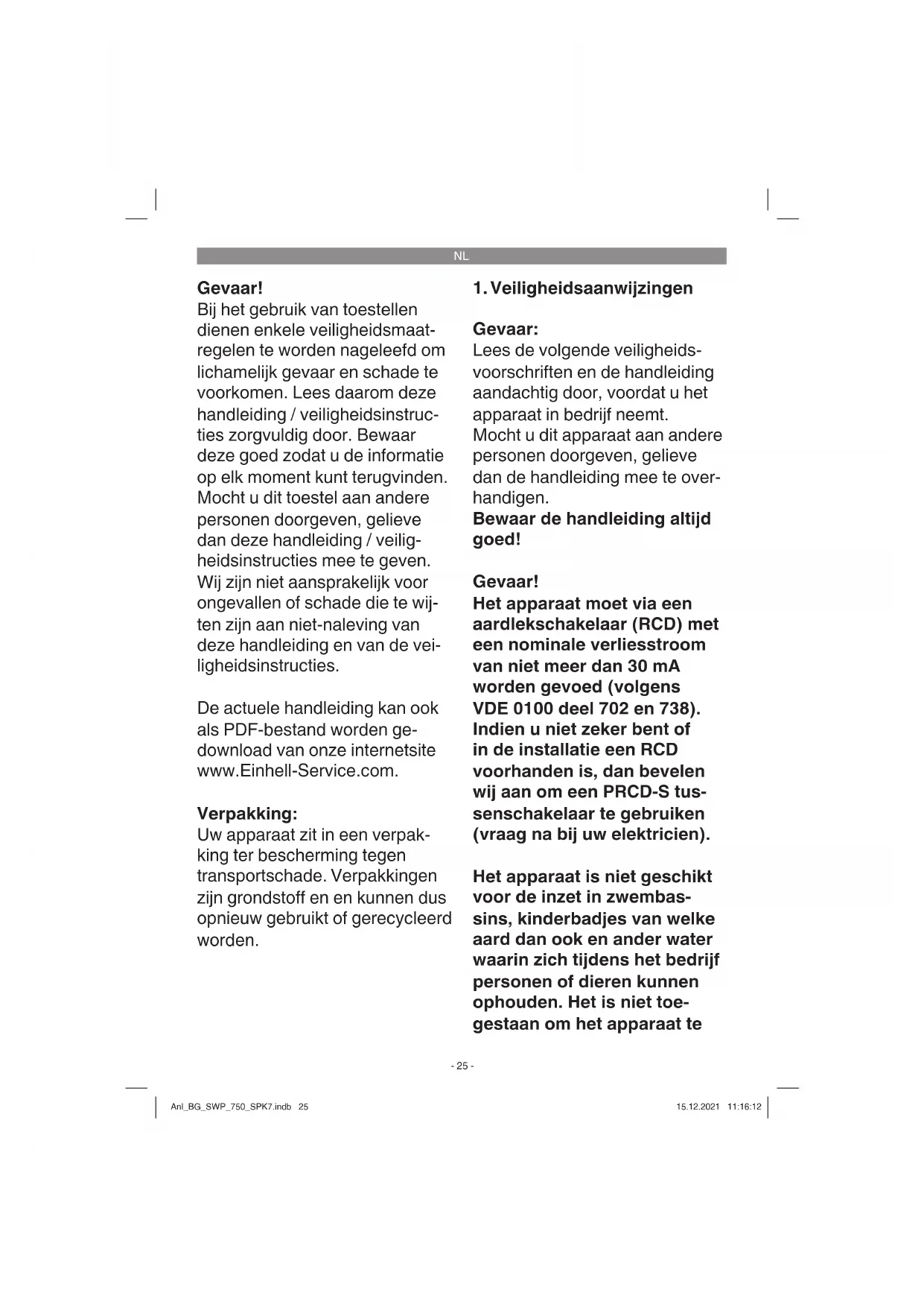 Gevaar: Lees de volgende veiligheids- voorschriften en de handleiding aandachtig door, voordat u het apparaat in bedrijf neemt. Mocht u dit apparaat aan andere personen doorgeven, gelieve dan de handleiding mee te over- handigen. Bewaar de handleiding altijd goed! Gevaar! Het apparaat moet via een aardlekschakelaar (RCD) met een nominale verliesstroom van niet meer dan 30 mA worden gevoed (volgens VDE 0100 deel 702 en 738). Indien u niet zeker bent of in de installatie een RCD voorhanden is, dan bevelen wij aan om een PRCD-S tus- senschakelaar te gebruiken (vraag na bij uw elektricien). Het apparaat is niet geschikt voor de inzet in zwembas- sins, kinderbadjes van welke aard dan ook en ander water waarin zich tijdens het bedrijf personen of dieren kunnen ophouden. Het is niet toe- gestaan om het apparaat te Anl_BG_SWP_750_SPK7.indb 25Anl_BG_SWP_750_SPK7.indb 25 15.12.2021 11:16:1215.12.2021 11:16:12NL
