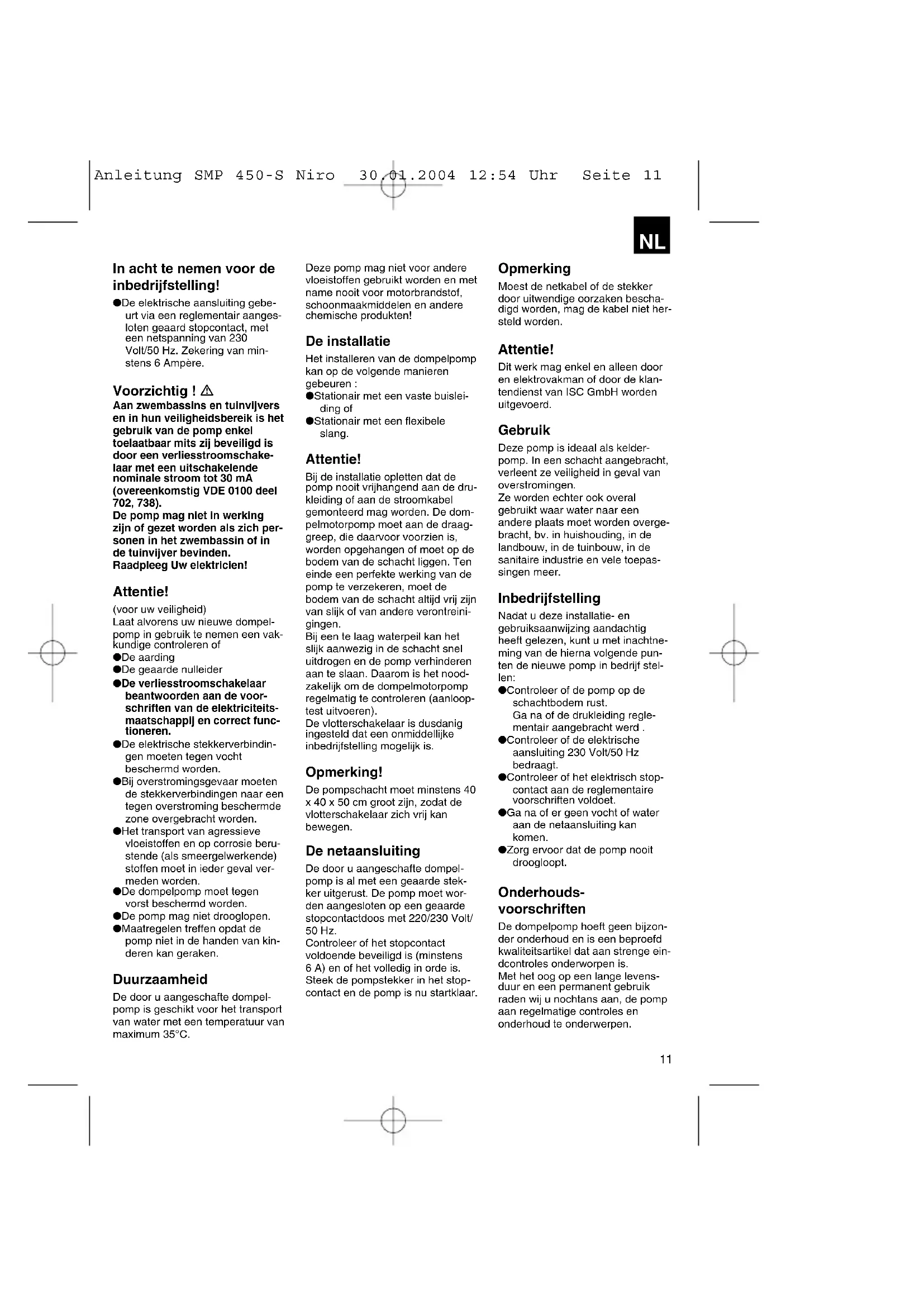 Tension de secteur 230V ~ 50 Hz Puissance absorbée 500 Watts Débit max 9.000 l/h Hauteur de refoulement max. 7 m Profondeur d’immersion max. 5 m Température de l’eau max. 35° C Raccord de tuyau 1 1/4” FE Corps étrangers jusqu’à ø 25 mm Hauteur point d´clenchement: MARCHE ca. 50 cm Hauteur point d´clenchement: ARRET ca. 5 cm No. d’article 41.703.30 Données techniques: Caractéristiques de puissance Hauteur de refoulement Débit SMP 450/1-S NIRO 1m max.: 8.000 l/h 2m max.: 6.600 l/h 3m max.: 5.400 l/h 4m max.: 4.000 l/h 5m max.: 2.700 l/h 6m max.: 1.200 l/h Anleitung SMP 450-S Niro 30.01.2004 12:54 Uhr Seite 1011 In acht te nemen voor de inbedrijfstelling! ● De elektrische aansluiting gebe- urt via een reglementair aanges- loten geaard stopcontact, met een netspanning van 230 Volt/50 Hz. Zekering van min- stens 6 Ampère. Voorzichtig ! Aan zwembassins en tuinvijvers en in hun veiligheidsbereik is het gebruik van de pomp enkel toelaatbaar mits zij beveiligd is door een verliesstroomschake- laar met een uitschakelende nominale stroom tot 30 mA (overeenkomstig VDE 0100 deel 702, 738). De pomp mag niet in werking zijn of gezet worden als zich per- sonen in het zwembassin of in de tuinvijver bevinden. Raadpleeg Uw elektricien! Attentie! (voor uw veiligheid) Laat alvorens uw nieuwe dompel- pomp in gebruik te nemen een vak- kundige controleren of ● De aarding ● De geaarde nulleider ● De verliesstroomschakelaar beantwoorden aan de voor- schriften van de elektriciteits- maatschappij en correct func- tioneren. ● De elektrische stekkerverbindin- gen moeten tegen vocht beschermd worden. ● Bij overstromingsgevaar moeten de stekkerverbindingen naar een tegen overstroming beschermde zone overgebracht worden. ● Het transport van agressieve vloeistoffen en op corrosie beru- stende (als smeergelwerkende) stoffen moet in ieder geval ver- meden worden. ● De dompelpomp moet tegen vorst beschermd worden. ● De pomp mag niet drooglopen. ● Maatregelen treffen opdat de pomp niet in de handen van kin- deren kan geraken. Duurzaamheid De door u aangeschafte dompel- pomp is geschikt voor het transport van water met een temperatuur van maximum 35°C. Opmerking Moest de netkabel of de stekker door uitwendige oorzaken bescha- digd worden, mag de kabel niet her- steld worden. Attentie! Dit werk mag enkel en alleen door en elektrovakman of door de klan- tendienst van ISC GmbH worden uitgevoerd. Gebruik Deze pomp is ideaal als kelder- pomp. In een schacht aangebracht, verleent ze veiligheid in geval van overstromingen. Ze worden echter ook overal gebruikt waar water naar een andere plaats moet worden overge- bracht, bv. in huishouding, in de landbouw, in de tuinbouw, in de sanitaire industrie en vele toepas- singen meer. Inbedrijfstelling Nadat u deze installatie- en gebruiksaanwijzing aandachtig heeft gelezen, kunt u met inachtne- ming van de hierna volgende pun- ten de nieuwe pomp in bedrijf stel- len: ● Controleer of de pomp op de schachtbodem rust. Ga na of de drukleiding regle- mentair aangebracht werd . ● Controleer of de elektrische aansluiting 230 Volt/50 Hz bedraagt. ● Controleer of het elektrisch stop- contact aan de reglementaire voorschriften voldoet. ● Ga na of er geen vocht of water aan de netaansluiting kan komen. ● Zorg ervoor dat de pomp nooit droogloopt. Onderhouds- voorschriften De dompelpomp hoeft geen bijzon- der onderhoud en is een beproefd kwaliteitsartikel dat aan strenge ein- dcontroles onderworpen is. Met het oog op een lange levens- duur en een permanent gebruik raden wij u nochtans aan, de pomp aan regelmatige controles en onderhoud te onderwerpen. Deze pomp mag niet voor andere vloeistoffen gebruikt worden en met name nooit voor motorbrandstof, schoonmaakmiddelen en andere chemische produkten! De installatie Het installeren van de dompelpomp kan op de volgende manieren gebeuren : ● Stationair met een vaste buislei- ding of ● Stationair met een flexibele slang. Attentie! Bij de installatie opletten dat de pomp nooit vrijhangend aan de dru- kleiding of aan de stroomkabel gemonteerd mag worden. De dom- pelmotorpomp moet aan de draag- greep, die daarvoor voorzien is, worden opgehangen of moet op de bodem van de schacht liggen. Ten einde een perfekte werking van de pomp te verzekeren, moet de bodem van de schacht altijd vrij zijn van slijk of van andere verontreini- gingen. Bij een te laag waterpeil kan het slijk aanwezig in de schacht snel uitdrogen en de pomp verhinderen aan te slaan. Daarom is het nood- zakelijk om de dompelmotorpomp regelmatig te controleren (aanloop- test uitvoeren). De vlotterschakelaar is dusdanig ingesteld dat een onmiddellijke inbedrijfstelling mogelijk is. Opmerking! De pompschacht moet minstens 40 x 40 x 50 cm groot zijn, zodat de vlotterschakelaar zich vrij kan bewegen. De netaansluiting De door u aangeschafte dompel- pomp is al met een geaarde stek- ker uitgerust. De pomp moet wor- den aangesloten op een geaarde stopcontactdoos met 220/230 Volt/ 50 Hz. Controleer of het stopcontact voldoende beveiligd is (minstens 6 A) en of het volledig in orde is. Steek de pompstekker in het stop- contact en de pomp is nu startklaar.