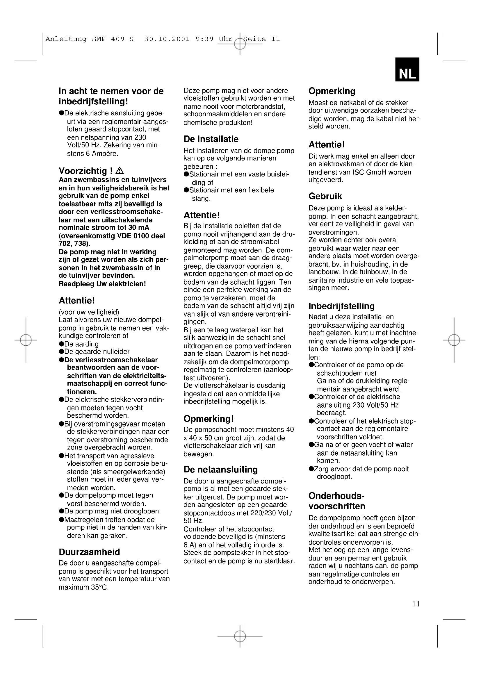 Tension de secteur 230V ~ 50 Hz Puissance absorbée 400 Watts Débit max 9.000 l/h Hauteur de refoulement max. 5 m Profondeur d’immersion max. 5 m Température de l’eau max. 35° C Raccord de tuyau 5/4” AG Corps étrangers jusqu’à ø 20 mm Hauteur point d´clenchement: MARCHE ca. 50 cm Hauteur point d´clenchement: ARRET ca. 5 cm No. d’article 41.705.40 Données techniques: Caractéristiques de puissance Hauteur de refoulement Débit SMP 409-S 2m max.: 7.000 l/h 3m max.: 5.500 l/h 4m max.: 3.000 l/h Anleitung SMP 409-S 30.10.2001 9:39 Uhr Seite 1011 In acht te nemen voor de inbedrijfstelling! ● De elektrische aansluiting gebe- urt via een reglementair aanges- loten geaard stopcontact, met een netspanning van 230 Volt/50 Hz. Zekering van min- stens 6 Ampère. Voorzichtig ! Aan zwembassins en tuinvijvers en in hun veiligheidsbereik is het gebruik van de pomp enkel toelaatbaar mits zij beveiligd is door een verliesstroomschake- laar met een uitschakelende nominale stroom tot 30 mA (overeenkomstig VDE 0100 deel 702, 738). De pomp mag niet in werking zijn of gezet worden als zich per- sonen in het zwembassin of in de tuinvijver bevinden. Raadpleeg Uw elektricien! Attentie! (voor uw veiligheid) Laat alvorens uw nieuwe dompel- pomp in gebruik te nemen een vak- kundige controleren of ● De aarding ● De geaarde nulleider ● De verliesstroomschakelaar beantwoorden aan de voor- schriften van de elektriciteits- maatschappij en correct func- tioneren. ● De elektrische stekkerverbindin- gen moeten tegen vocht beschermd worden. ● Bij overstromingsgevaar moeten de stekkerverbindingen naar een tegen overstroming beschermde zone overgebracht worden. ● Het transport van agressieve vloeistoffen en op corrosie beru- stende (als smeergelwerkende) stoffen moet in ieder geval ver- meden worden. ● De dompelpomp moet tegen vorst beschermd worden. ● De pomp mag niet drooglopen. ● Maatregelen treffen opdat de pomp niet in de handen van kin- deren kan geraken. Duurzaamheid De door u aangeschafte dompel- pomp is geschikt voor het transport van water met een temperatuur van maximum 35°C. Opmerking Moest de netkabel of de stekker door uitwendige oorzaken bescha- digd worden, mag de kabel niet her- steld worden. Attentie! Dit werk mag enkel en alleen door en elektrovakman of door de klan- tendienst van ISC GmbH worden uitgevoerd. Gebruik Deze pomp is ideaal als kelder- pomp. In een schacht aangebracht, verleent ze veiligheid in geval van overstromingen. Ze worden echter ook overal gebruikt waar water naar een andere plaats moet worden overge- bracht, bv. in huishouding, in de landbouw, in de tuinbouw, in de sanitaire industrie en vele toepas- singen meer. Inbedrijfstelling Nadat u deze installatie- en gebruiksaanwijzing aandachtig heeft gelezen, kunt u met inachtne- ming van de hierna volgende pun- ten de nieuwe pomp in bedrijf stel- len: ● Controleer of de pomp op de schachtbodem rust. Ga na of de drukleiding regle- mentair aangebracht werd . ● Controleer of de elektrische aansluiting 230 Volt/50 Hz bedraagt. ● Controleer of het elektrisch stop- contact aan de reglementaire voorschriften voldoet. ● Ga na of er geen vocht of water aan de netaansluiting kan komen. ● Zorg ervoor dat de pomp nooit droogloopt. Onderhouds- voorschriften De dompelpomp hoeft geen bijzon- der onderhoud en is een beproefd kwaliteitsartikel dat aan strenge ein- dcontroles onderworpen is. Met het oog op een lange levens- duur en een permanent gebruik raden wij u nochtans aan, de pomp aan regelmatige controles en onderhoud te onderwerpen. Deze pomp mag niet voor andere vloeistoffen gebruikt worden en met name nooit voor motorbrandstof, schoonmaakmiddelen en andere chemische produkten! De installatie Het installeren van de dompelpomp kan op de volgende manieren gebeuren : ● Stationair met een vaste buislei- ding of ● Stationair met een flexibele slang. Attentie! Bij de installatie opletten dat de pomp nooit vrijhangend aan de dru- kleiding of aan de stroomkabel gemonteerd mag worden. De dom- pelmotorpomp moet aan de draag- greep, die daarvoor voorzien is, worden opgehangen of moet op de bodem van de schacht liggen. Ten einde een perfekte werking van de pomp te verzekeren, moet de bodem van de schacht altijd vrij zijn van slijk of van andere verontreini- gingen. Bij een te laag waterpeil kan het slijk aanwezig in de schacht snel uitdrogen en de pomp verhinderen aan te slaan. Daarom is het nood- zakelijk om de dompelmotorpomp regelmatig te controleren (aanloop- test uitvoeren). De vlotterschakelaar is dusdanig ingesteld dat een onmiddellijke inbedrijfstelling mogelijk is. Opmerking! De pompschacht moet minstens 40 x 40 x 50 cm groot zijn, zodat de vlotterschakelaar zich vrij kan bewegen. De netaansluiting De door u aangeschafte dompel- pomp is al met een geaarde stek- ker uitgerust. De pomp moet wor- den aangesloten op een geaarde stopcontactdoos met 220/230 Volt/ 50 Hz. Controleer of het stopcontact voldoende beveiligd is (minstens 6 A) en of het volledig in orde is. Steek de pompstekker in het stop- contact en de pomp is nu startklaar.
