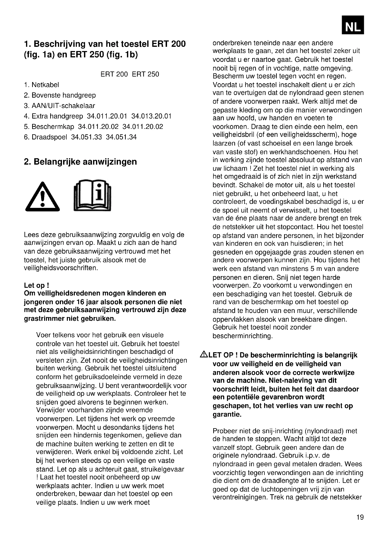 Lees deze gebruiksaanwijzing zorgvuldig en volg de aanwijzingen ervan op. Maakt u zich aan de hand van deze gebruiksaanwijzing vertrouwd met het toestel, het juiste gebruik alsook met de veiligheidsvoorschriften. Let op ! Om veiligheidsredenen mogen kinderen en jongeren onder 16 jaar alsook personen die niet met deze gebruiksaanwijzing vertrouwd zijn deze grastrimmer niet gebruiken. Voer telkens voor het gebruik een visuele controle van het toestel uit. Gebruik het toestel niet als veiligheidsinrichtingen beschadigd of versleten zijn. Zet nooit de veiligheidsinrichtingen buiten werking. Gebruik het toestel uitsluitend conform het gebruiksdoeleinde vermeld in deze gebruiksaanwijzing. U bent verantwoordelijk voor de veiligheid op uw werkplaats. Controleer het te snijden goed alvorens te beginnen werken. Verwijder voorhanden zijnde vreemde voorwerpen. Let tijdens het werk op vreemde voorwerpen. Mocht u desondanks tijdens het snijden een hindernis tegenkomen, gelieve dan de machine buiten werking te zetten en dit te verwijderen. Werk enkel bij voldoende zicht. Let bij het werken steeds op een veilige en vaste stand. Let op als u achteruit gaat, struikelgevaar ! Laat het toestel nooit onbeheerd op uw werkplaats achter. Indien u uw werk moet onderbreken, bewaar dan het toestel op een veilige plaats. Indien u uw werk moet onderbreken teneinde naar een andere werkplaats te gaan, zet dan het toestel zeker uit voordat u er naartoe gaat. Gebruik het toestel nooit bij regen of in vochtige, natte omgeving. Bescherm uw toestel tegen vocht en regen. Voordat u het toestel inschakelt dient u er zich van te overtuigen dat de nylondraad geen stenen of andere voorwerpen raakt. Werk altijd met de gepaste kleding om op die manier verwondingen aan uw hoofd, uw handen en voeten te voorkomen. Draag te dien einde een helm, een veiligheidsbril (of een veiligheidsscherm), hoge laarzen (of vast schoeisel en een lange broek van vaste stof) en werkhandschoenen. Hou het in werking zijnde toestel absoluut op afstand van uw lichaam ! Zet het toestel niet in werking als het omgedraaid is of zich niet in zijn werkstand bevindt. Schakel de motor uit, als u het toestel niet gebruikt, u het onbeheerd laat, u het controleert, de voedingskabel beschadigd is, u er de spoel uit neemt of verwisselt, u het toestel van de éne plaats naar de andere brengt en trek de netstekker uit het stopcontact. Hou het toestel op afstand van andere personen, in het bijzonder van kinderen en ook van huisdieren; in het gesneden en opgejaagde gras zouden stenen en andere voorwerpen kunnen zijn. Hou tijdens het werk een afstand van minstens 5 m van andere personen en dieren. Snij niet tegen harde voorwerpen. Zo voorkomt u verwondingen en een beschadiging van het toestel. Gebruik de rand van de beschermkap om het toestel op afstand te houden van een muur, verschillende oppervlakken alsook van breekbare dingen. Gebruik het toestel nooit zonder bescherminrichting. LET OP ! De bescherminrichting is belangrijk voor uw veiligheid en de veiligheid van anderen alsook voor de correcte werkwijze van de machine. Niet-naleving van dit voorschrift leidt, buiten het feit dat daardoor een potentiële gevarenbron wordt geschapen, tot het verlies van uw recht op garantie. Probeer niet de snij-inrichting (nylondraad) met de handen te stoppen. Wacht altijd tot deze vanzelf stopt. Gebruik geen andere dan de originele nylondraad. Gebruik i.p.v. de nylondraad in geen geval metalen draden. Wees voorzichtig tegen verwondingen aan de inrichting die dient om de draadlengte af te snijden. Let er goed op dat de luchtopeningen vrij zijn van verontreinigingen. Trek na gebruik de netstekker NL20 uit het stopcontact en controleer de machine op beschadiging. Probeer niet met het toestel gras te snijden dat niet op de grond groeit; probeer b.v. niet gras te snijden dat op muren of stenen enz. groeit. Binnen het werkgebied van de grastrimmer is de gebruiker verantwoordelijk tegenover derden voor schade berokkend door het gebruik van het toestel. Steek met ingeschakeld toestel geen wegen of grindpaden over. Als u het toestel niet gebruikt bewaar het op een droge en voor kinderen onbereikbare plaats. Gebruik het toestel enkel op de manier beschreven in deze gebruiksaanwijzing en hou het altijd loodrecht t.o.v. de grond. Elke andere stand is gevaarlijk. Controleer regelmatig of de schroeven naar behoren zijn aangehaald. De netspanning moet overeenstemmen met de spanning vermeld op het kenplaatje. De aansluitkabel dient regelmatig op tekens van beschadiging of veroudering te worden gecontroleerd. Het toestel mag niet gebruikt worden als de aansluitkabel niet in perfecte staat is. De gebruikte aansluitkabels mogen niet lichter zijn dan lichte rubberslangkabels HO7RN-F volgens DIN 282/VDE 0282 en moeten een minimumdiameter van 1,5 mm_ hebben. De insteekverbindingen moeten voorzien zijn van een randaarding en de koppeling moet spatwaterdicht zijn. De te snijden vlakte altijd vrij houden van kabels en andere voorwerpen. Indien het toestel moet worden opgeheven om het te transporteren, dient u de motor stop te zetten en te wachten tot het gereedschap stilstaat. Voordat u het toestel verlaat moet de motor worden stopgezet en moet de netstekker uit het stopcontact worden getrokken. Vergewis u er zich van dat geen van de draaiende elementen beschadigd is en dat de draadspoel correct is geïnstalleerd en bevestigd alvorens het toestel aan te sluiten op het stroomnet. Tijdens het bedrijf mag u in geen geval tegen harde voorwerpen snijden. Enkel op die manier voorkomt u verwondingen van de bediener en een beschadiging van het toestel. Gebruik voor het onderhoud enkel originele wisselstukken. Herstellingen mogen enkel door een elektrovakman worden uitgevoerd. Voordat u de machine in gebruik neemt en na één of andere botsing dient u ze op tekens van slijtage of beschadiging te controleren en noodzakelijke herstellingen te laten doorvoeren. Hou altijd handen en voeten weg van de snij-inrichting, voor