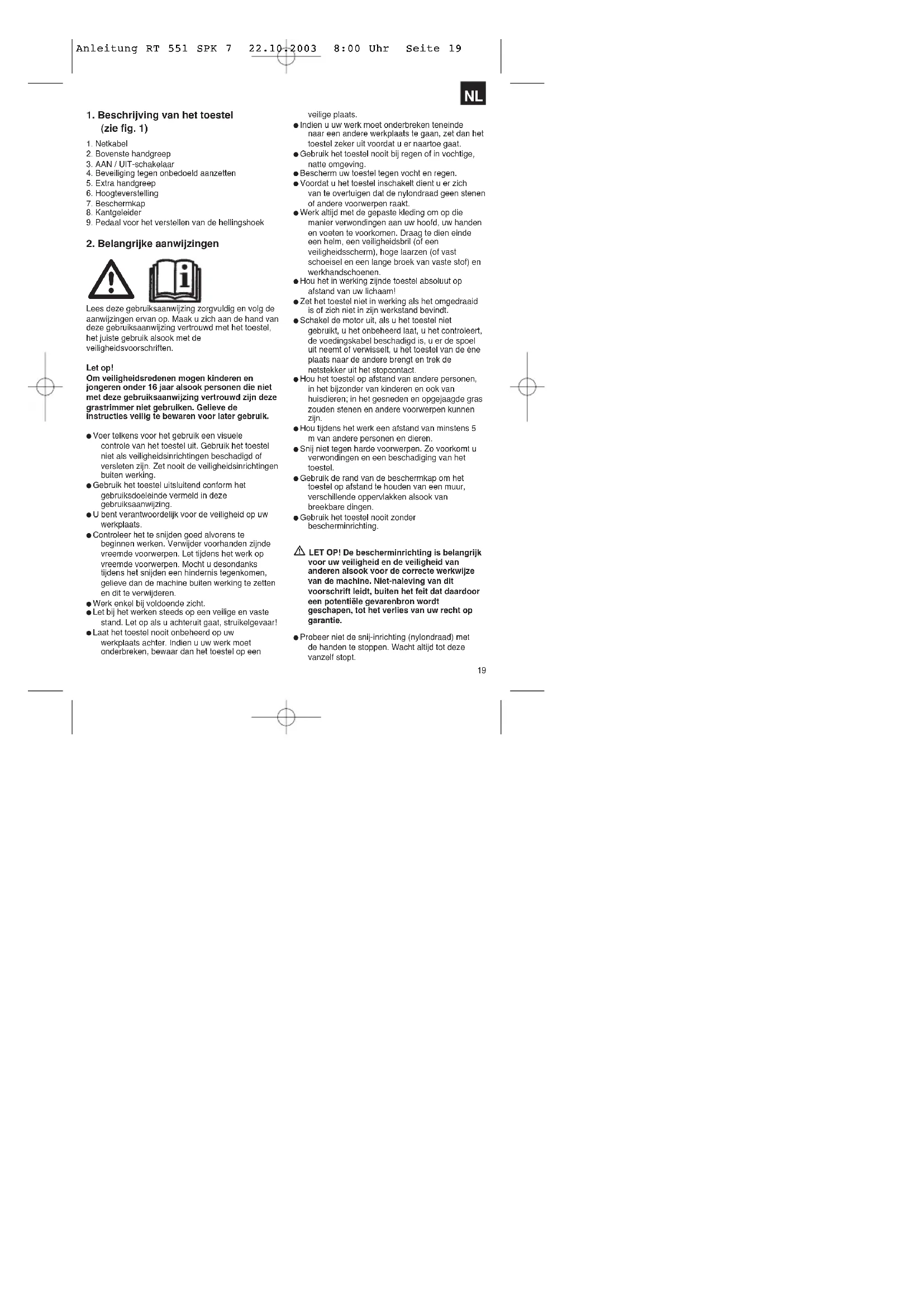 Gebruik geen andere dan de originele nylondraad. Gebruik i.p.v. de nylondraad in geen geval metalen draden. Wees voorzichtig tegen verwondingen aan de inrichting die dient om de draadlengte af te snijden. Let er goed op dat de luchtopeningen vrij zijn van verontreinigingen. Trek na gebruik de netstekker uit het stopcontact en controleer de machine op beschadiging. Probeer niet met het toestel gras te snijden dat niet op de grond groeit; probeer b.v. niet gras te snijden dat op muren of stenen enz. groeit. Binnen het werkgebied van de grastrimmer is de gebruiker verantwoordelijk tegenover derden voor schade berokkend door het gebruik van het toestel. Steek met ingeschakeld toestel geen wegen of grindpaden over. Als u het toestel niet gebruikt bewaar het op een droge en voor kinderen onbereikbare plaats. Gebruik het toestel enkel op de manier beschreven in deze gebruiksaanwijzing en hou het altijd loodrecht t.o.v. de grond. Elke andere stand is gevaarlijk. Controleer regelmatig of de schroeven naar behoren zijn aangehaald. De netspanning moet overeenstemmen met de spanning vermeld op het kenplaatje. De aansluitkabel dient regelmatig op tekens van beschadiging of veroudering te worden gecontroleerd. Het toestel mag niet gebruikt worden als de aansluitkabel niet in perfecte staat is. De gebruikte aansluitkabels mogen niet lichter zijn dan lichte rubberslangkabels HO7RN-F volgens DIN 282/VDE 0282 en moeten een minimumdiameter van 1,5 mm
