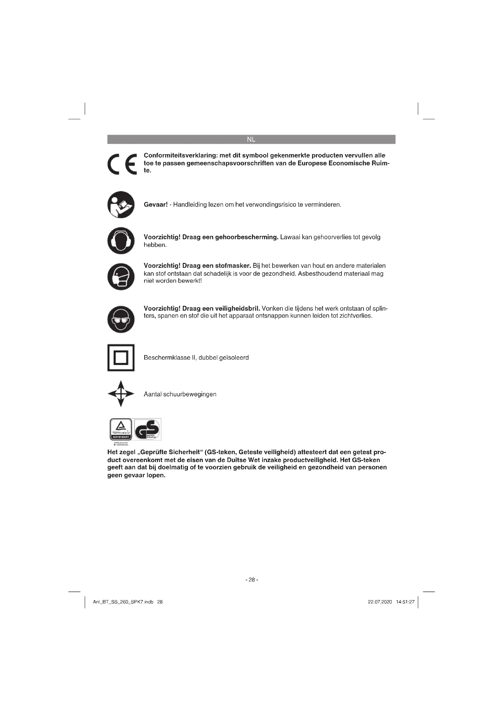 Gevaar! - Handleiding lezen om het verwondingsrisico te verminderen. Voorzichtig! Draag een gehoorbescherming. Lawaai kan gehoorverlies tot gevolg hebben. Voorzichtig! Draag een veiligheidsbril. Vonken die tijdens het werk ontstaan of splin- ters, spanen en stof die uit het apparaat ontsnappen kunnen leiden tot zichtverlies. Voorzichtig! Draag een stofmasker. Bij het bewerken van hout en andere materialen kan stof ontstaan dat schadelijk is voor de gezondheid. Asbesthoudend materiaal mag niet worden bewerkt! Beschermklasse II, dubbel geïsoleerd Conformiteitsverklaring: met dit symbool gekenmerkte producten vervullen alle toe te passen gemeenschapsvoorschriften van de Europese Economische Ruim- te. Het zegel „Geprüfte Sicherheit“ (GS-teken, Geteste veiligheid) attesteert dat een getest pro- duct overeenkomt met de eisen van de Duitse Wet inzake productveiligheid. Het GS-teken geeft aan dat bij doelmatig of te voorzien gebruik de veiligheid en gezondheid van personen geen gevaar lopen. Aantal schuurbewegingen Anl_BT_SS_260_SPK7.indb 28Anl_BT_SS_260_SPK7.indb 28 22.07.2020 14:51:2722.07.2020 14:51:27NL