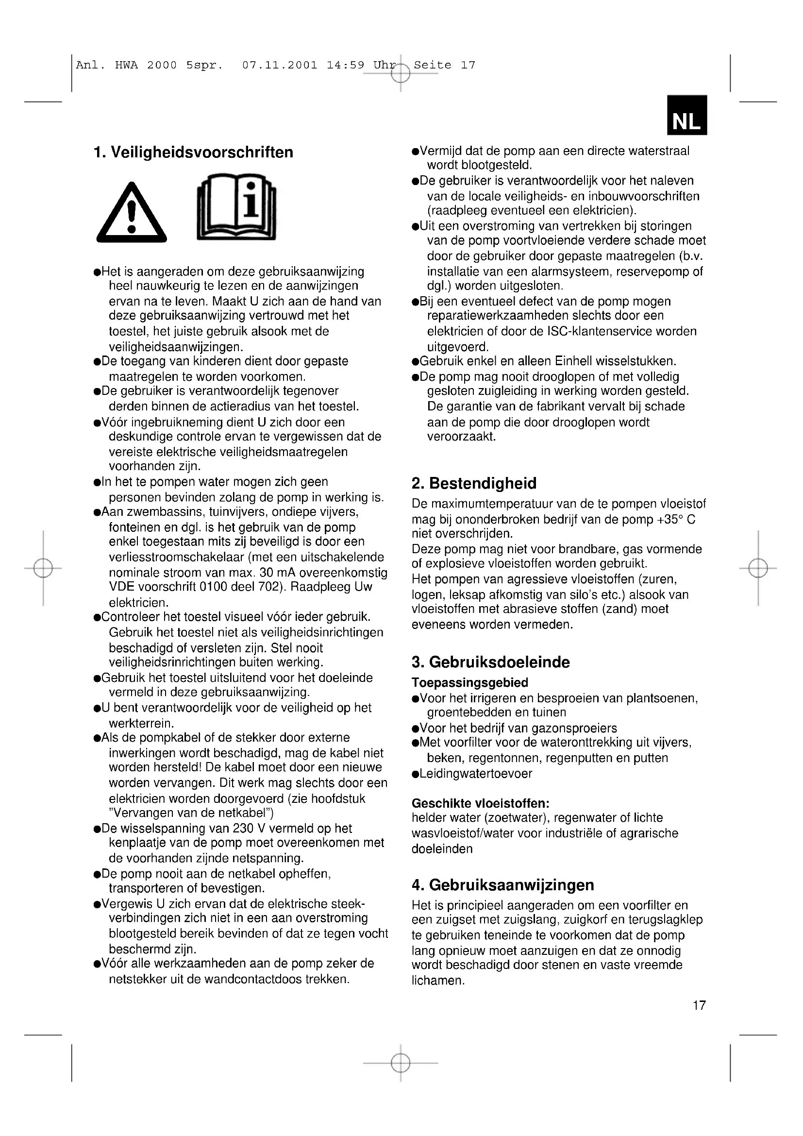 Anl. HWA 2000 5spr. 07.11.2001 14:59 Uhr Seite 176. Elektrische aansluiting De pomp moet worden aangesloten aan een wandcontactdoos met aardingscontact 230 V ~ 50 Hz. Beveiliging minstens 10 ampère. Het in- en uitschakelen gebeurt met behulp van de ingebouwde schakelaar. De verklikker in de schakelaar licht op bij ingeschakelde motor. De ingebouwde motorveiligheidsschakelaar beschermt de motor tegen overbelasting of blokkering. In geval van oververhitting wordt de pomp automatisch uitgeschakeld. Na het afkoelen wordt de pomp opnieuw automatisch ingeschakeld.