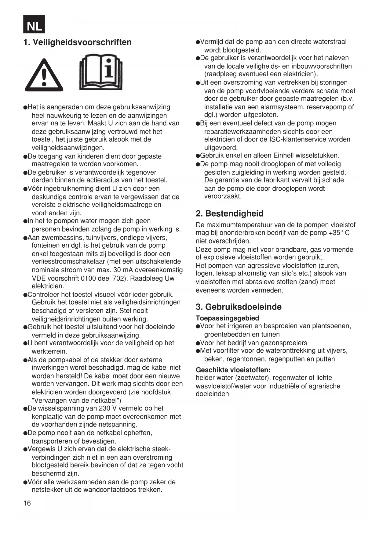 Het is aangeraden om deze gebruiksaanwijzing heel nauwkeurig te lezen en de aanwijzingen ervan na te leven. Maakt U zich aan de hand van deze gebruiksaanwijzing vertrouwd met het toestel, het juiste gebruik alsook met de veiligheidsaanwijzingen. De toegang van kinderen dient door gepaste maatregelen te worden voorkomen. De gebruiker is verantwoordelijk tegenover derden binnen de actieradius van het toestel. Vóór ingebruikneming dient U zich door een deskundige controle ervan te vergewissen dat de vereiste elektrische veiligheidsmaatregelen voorhanden zijn. In het te pompen water mogen zich geen personen bevinden zolang de pomp in werking is. Aan zwembassins, tuinvijvers, ondiepe vijvers, fonteinen en dgl. is het gebruik van de pomp enkel toegestaan mits zij beveiligd is door een verliesstroomschakelaar (met een uitschakelende nominale stroom van max. 30 mA overeenkomstig VDE voorschrift 0100 deel 702). Raadpleeg Uw elektricien. Controleer het toestel visueel vóór ieder gebruik. Gebruik het toestel niet als veiligheidsinrichtingen beschadigd of versleten zijn. Stel nooit veiligheidsrinrichtingen buiten werking. Gebruik het toestel uitsluitend voor het doeleinde vermeld in deze gebruiksaanwijzing. U bent verantwoordelijk voor de veiligheid op het werkterrein. Als de pompkabel of de stekker door externe inwerkingen wordt beschadigd, mag de kabel niet worden hersteld! De kabel moet door een nieuwe worden vervangen. Dit werk mag slechts door een elektricien worden doorgevoerd (zie hoofdstuk ”Vervangen van de netkabel”) De wisselspanning van 230 V vermeld op het kenplaatje van de pomp moet overeenkomen met de voorhanden zijnde netspanning. De pomp nooit aan de netkabel opheffen, transporteren of bevestigen. Vergewis U zich ervan dat de elektrische steek- verbindingen zich niet in een aan overstroming blootgesteld bereik bevinden of dat ze tegen vocht beschermd zijn. Vóór alle werkzaamheden aan de pomp zeker de netstekker uit de wandcontactdoos trekken. Vermijd dat de pomp aan een directe waterstraal wordt blootgesteld. De gebruiker is verantwoordelijk voor het naleven van de locale veiligheids- en inbouwvoorschriften (raadpleeg eventueel een elektricien). Uit een overstroming van vertrekken bij storingen van de pomp voortvloeiende verdere schade moet door de gebruiker door gepaste maatregelen (b.v. installatie van een alarmsysteem, reservepomp of dgl.) worden uitgesloten. Bij een eventueel defect van de pomp mogen reparatiewerkzaamheden slechts door een elektricien of door de ISC-klantenservice worden uitgevoerd. Gebruik enkel en alleen Einhell wisselstukken. De pomp mag nooit drooglopen of met volledig gesloten zuigleiding in werking worden gesteld. De garantie van de fabrikant vervalt bij schade aan de pomp die door drooglopen wordt veroorzaakt.