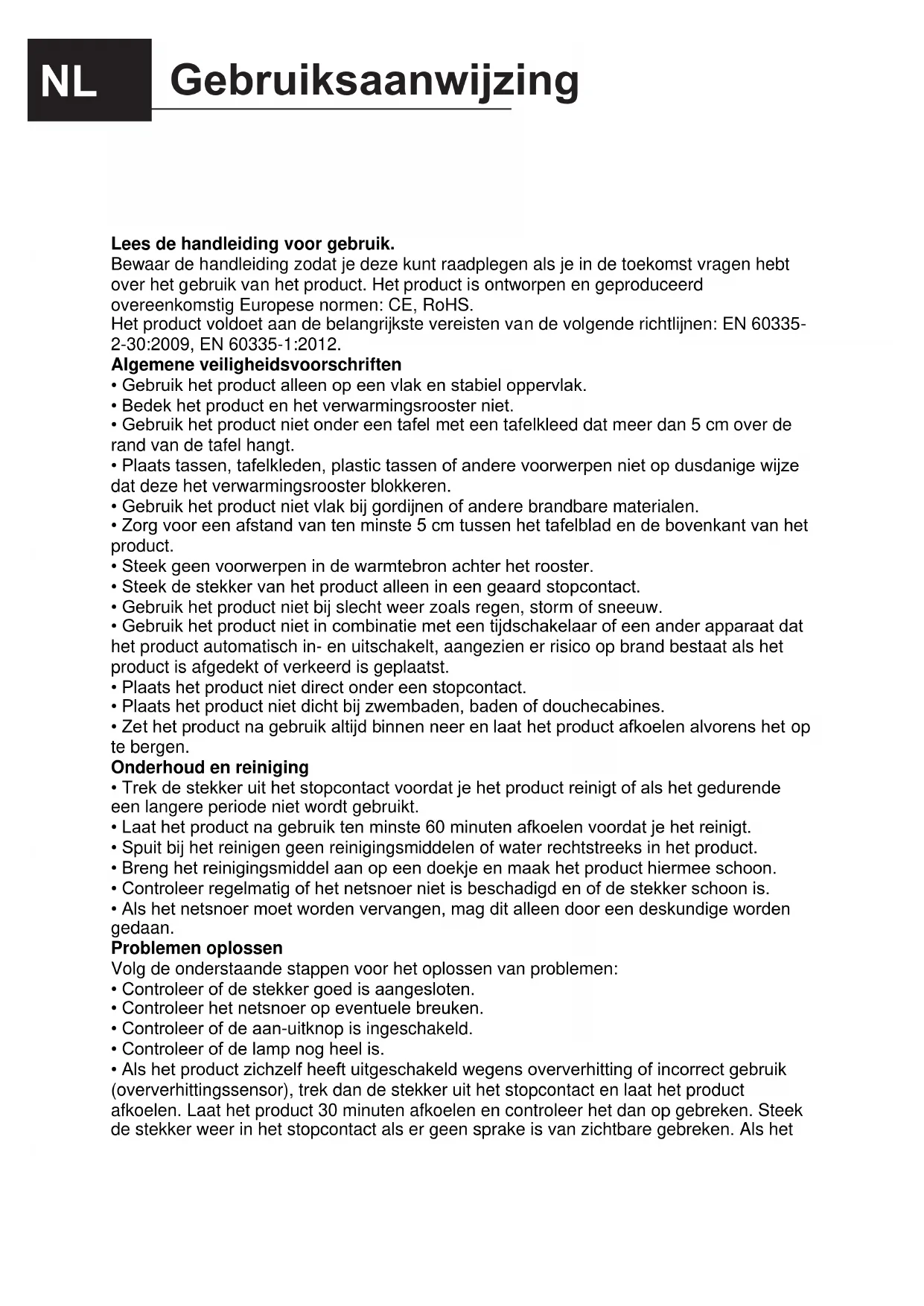 - Als het product zichzelf heeft uitgeschakeld wegens oververhitting of incorrect gebruik (oververhittingssensor), trek dan de stekker uit het stopcontact en laat het product afkoelen. Laat het product 30 minuten afkoelen en controleer het dan op gebreken. Steek de stekker weer in het stopcontact als er geen sprake is van zichtbare gebreken. Als het Gebruiksaanwijzing NLproduct nog steeds niet werkt, neem je best contact op met de winkel waar je het product hebt gekocht. Weggooien In EU-richtlijn 2002/96/EU betreffende afgedankte elektrische en elektronische apparatuur (AEEA) , afgekort tot de WEEE-richtlijn (Waste of Electrical and Electronic Equipment), staat dat afgedankte huishoudelijke apparatuur niet mag worden weggegooid als normaal huisvuil. De apparaten moeten apart worden ingezameld om hergebruik en recycling van materialen te maximaliseren en de impact op de volksgezondheid en het milieu te beperken. Een product dat moet worden gesorteerd, is voorzien van een symbool van een afvalcontainer met een kruis erdoor. Dit om consumenten aan hun verplichtingen met betrekking tot het sorteren van afval te herinneren. Consumenten dienen contact op te nemen met de winkel waar ze het product hebben gekocht, de gemeente of de plaatselijke vuilophaaldienst om te achterhalen op welke wijze dit product moet worden afgevoerd. Garantie De productgarantie voldoet aan de Deense Wet Verkoop van Goederen (Købeloven). De garantieperiode gaat in op de dag van aankoop van het product. Garantieverwerking Een product dat gebreken vertoont, dient met een geldig aankoopbewijs te worden geretourneerd aan de plaats van aankoop. Als het product gedurende de garantieperiode gebreken vertoont, dient het product aan de plaats van aankoop te worden geretourneerd. Afstand van garantie Schade of gebreken voortvloeiend uit misbruik of incorrect gebruik van het product vallen niet onder de garantie. Ook geldt de garantie niet in geval van overmacht, zoals blikseminslagen, overstromingen, brand of schade opgelopen tijdens transport. De garantie komt te vervallen als het product op enige wijze wordt gewijzigd of aangepast of als een externe partij reparatiewerkzaamheden aan het product uitvoert.Lees de handleiding vóór gebruik. Houd de handleiding in de buurt als naslagwerk in geval van vragen bij toekomstig gebruik van uw product. Het product is ontworpen en geproduceerd volgens Europese normen: CE, RoHS. Het product voldoet aan de belangrijkste vereisten in de richtlijnen: EN 60335-2-30:2009, EN 60335-1:2012. Algemene veiligheidsvoorschriften