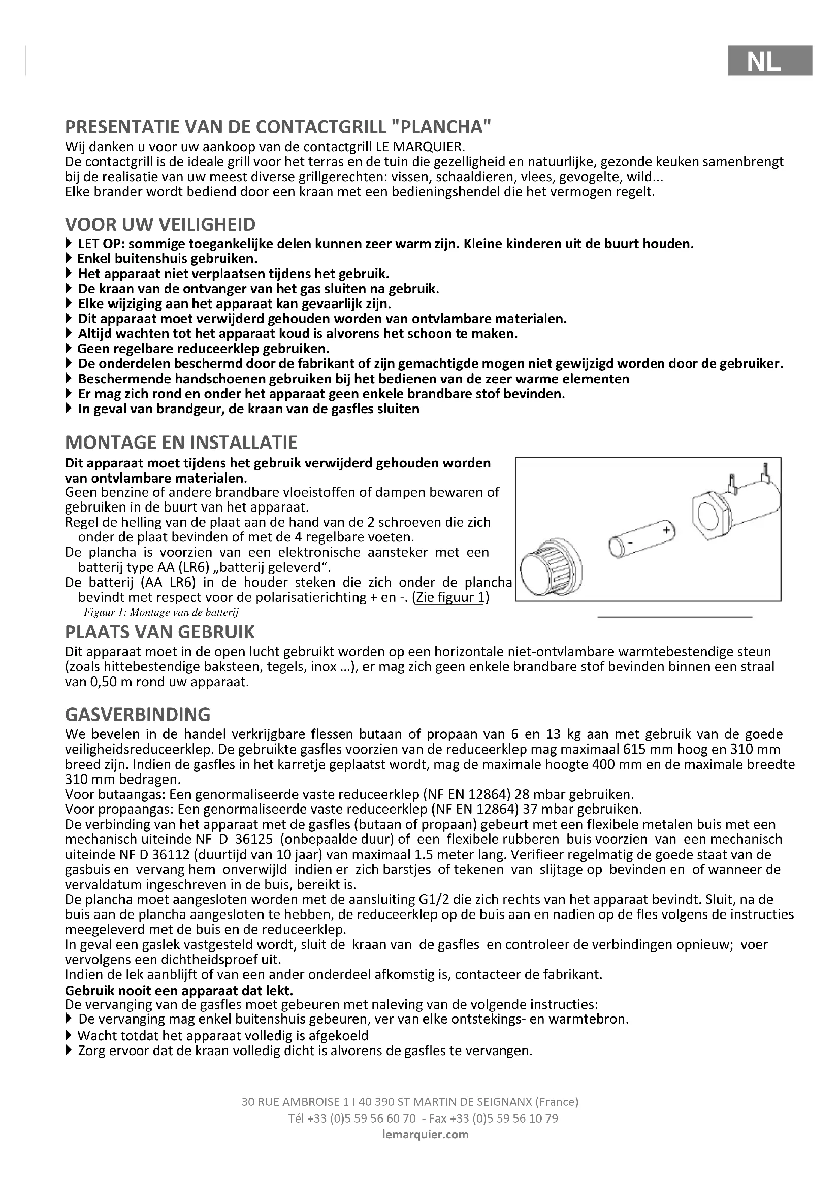 Dit apparaat moet in de open lucht gebruikt worden op een horizontale niet-ontvlambare warmtebestendige steun (zoals hittebestendige baksteen, tegels, inox …), er mag zich geen enkele brandbare stof bevinden binnen een straal van 0,50 m rond uw apparaat. GASVERBINDING We bevelen in de handel verkrijgbare flessen butaan of propaan van 6 en 13 kg aan met gebruik van de goede veiligheidsreduceerklep. De gebruikte gasfles voorzien van de reduceerklep mag maximaal 615 mm hoog en 310 mm breed zijn. Indien de gasfles in het karretje geplaatst wordt, mag de maximale hoogte 400 mm en de maximale breedte 310 mm bedragen. Voor butaangas: Een genormaliseerde vaste reduceerklep (NF EN 12864) 28 mbar gebruiken. Voor propaangas: Een genormaliseerde vaste reduceerklep (NF EN 12864) 37 mbar gebruiken. De verbinding van het apparaat met de gasfles (butaan of propaan) gebeurt met een flexibele metalen buis met een mechanisch uiteinde NF D 36125 (onbepaalde duur) of een flexibele rubberen buis voorzien van een mechanisch uiteinde NF D 36112 (duurtijd van 10 jaar) van maximaal 1.5 meter lang. Verifieer regelmatig de goede staat van de gasbuis en vervang hem onverwijld indien er zich barstjes of tekenen van slijtage op bevinden en of wanneer de vervaldatum ingeschreven in de buis, bereikt is. De plancha moet aangesloten worden met de aansluiting G1/2 die zich rechts van het apparaat bevindt. Sluit, na de buis aan de plancha aangesloten te hebben, de reduceerklep op de buis aan en nadien op de fles volgens de instructies meegeleverd met de buis en de reduceerklep. In geval een gaslek vastgesteld wordt, sluit de kraan van de gasfles en controleer de verbindingen opnieuw; voer vervolgens een dichtheidsproef uit. Indien de lek aanblijft of van een ander onderdeel afkomstig is, contacteer de fabrikant. Gebruik nooit een apparaat dat lekt. De vervanging van de gasfles moet gebeuren met naleving van de volgende instructies: De vervanging mag enkel buitenshuis gebeuren, ver van elke ontstekings- en warmtebron. Wacht totdat het apparaat volledig is afgekoeld Zorg ervoor dat de kraan volledig dicht is alvorens de gasfles te vervangen.NL 30 RUE AMBROISE 1 I 40 390 ST MARTIN DE SEIGNANX (France) Tél +33 (0)5 59 56 60 70 - Fax +33 (0)5 59 56 10 79 lemarquier.com