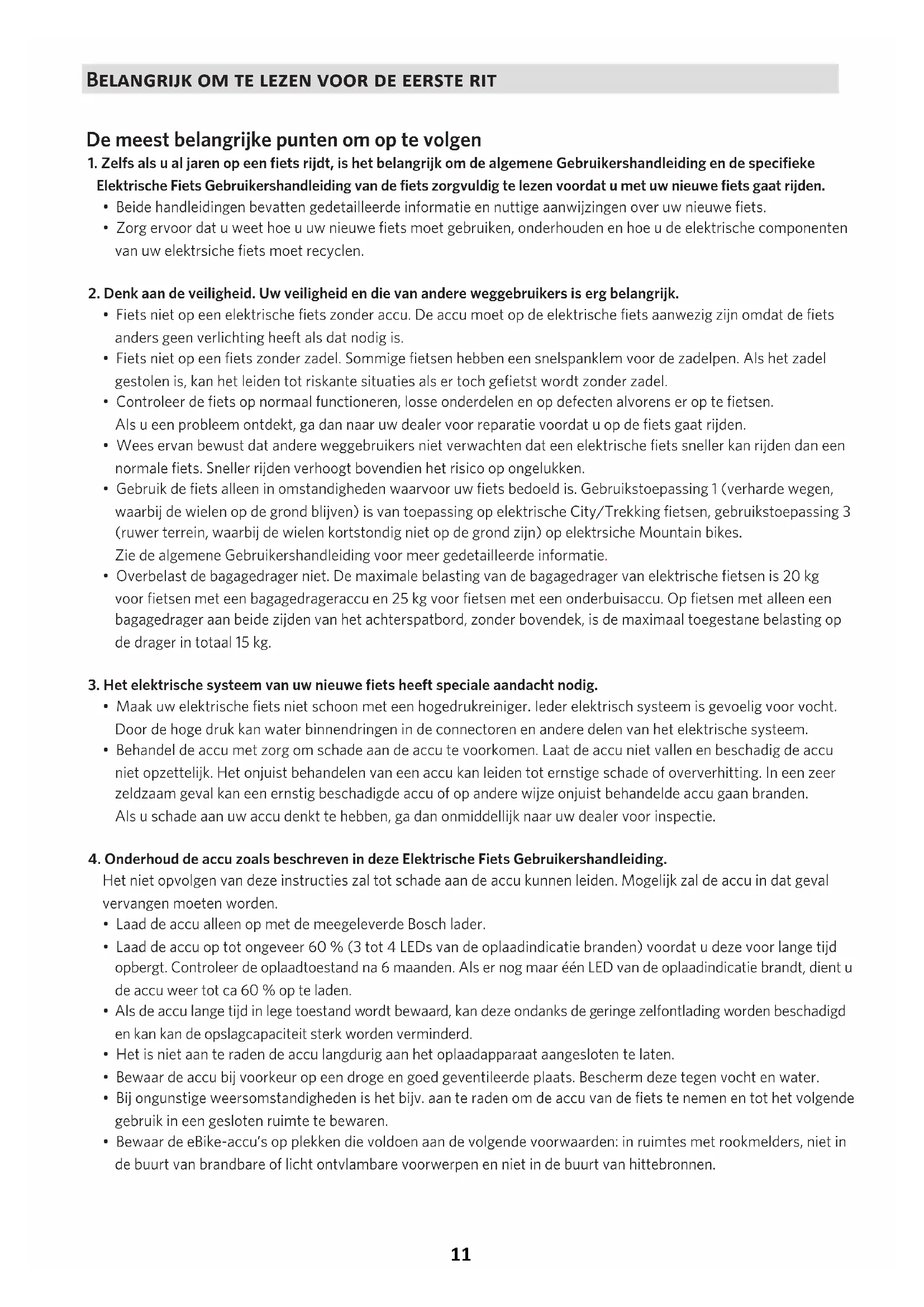 4. Onderhoud de accu zoals beschreven in deze Elektrische Fiets Gebruikershandleiding.