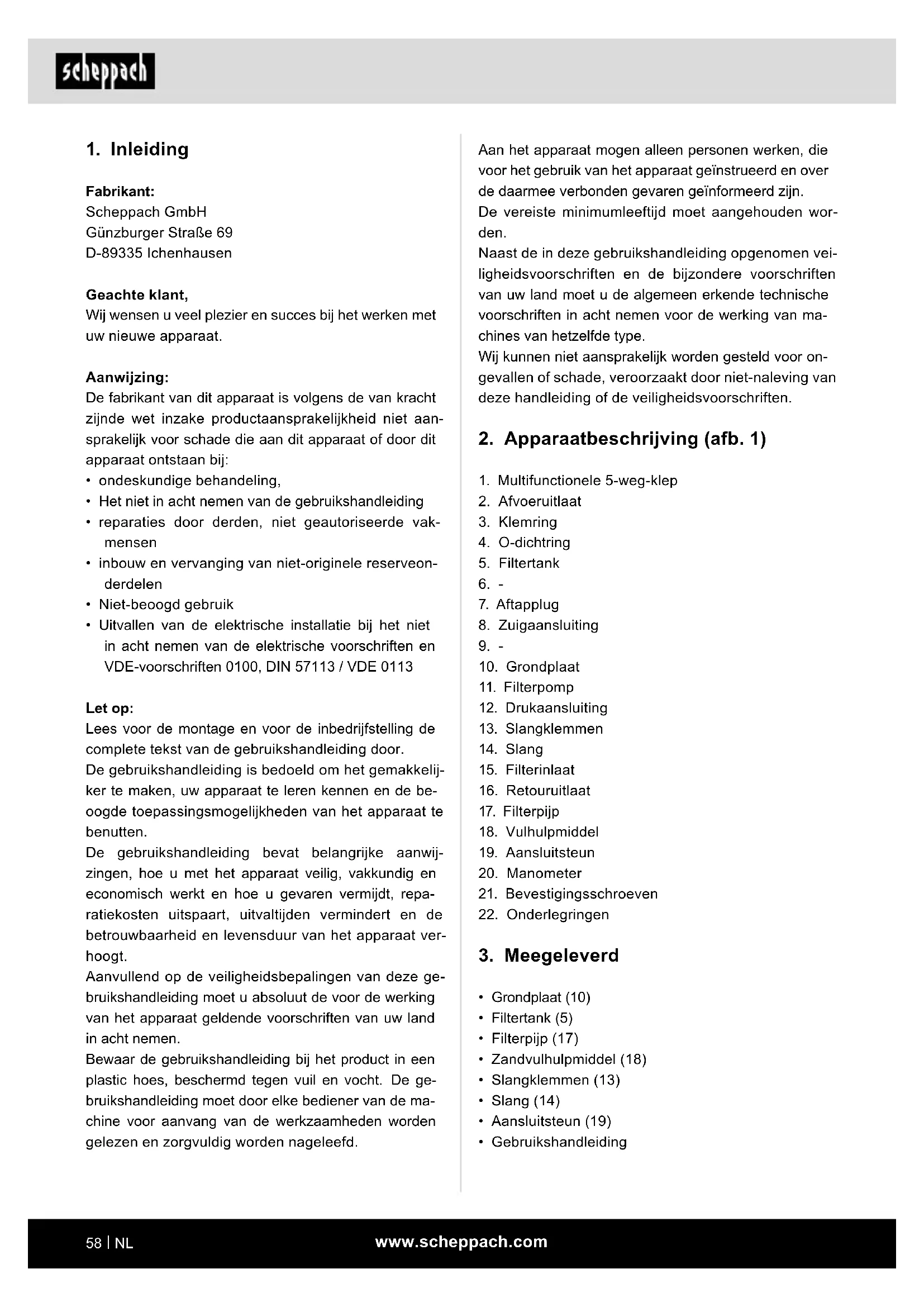 Fabrikant: Scheppach GmbH Günzburger Straße 69 D-89335 Ichenhausen Geachte klant, Wij wensen u veel plezier en succes bij het werken met uw nieuwe apparaat. Aanwijzing: De fabrikant van dit apparaat is volgens de van kracht zijnde wet inzake productaansprakelijkheid niet aan- sprakelijk voor schade die aan dit apparaat of door dit apparaat ontstaan bij: