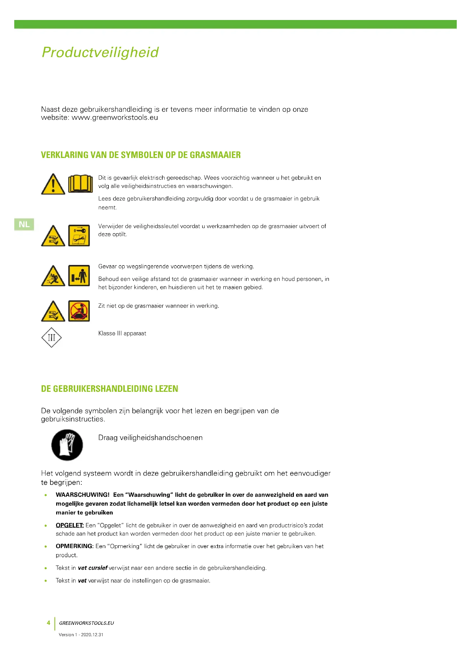 Version 1 - 2020.12.31 VERKLARING VAN DE SYMBOLEN OP DE GRASMAAIER Dit is gevaarlijk elektrisch gereedschap. Wees voorzichtig wanneer u het gebruikt en volg alle veiligheidsinstructies en waarschuwingen. Lees deze gebruikershandleiding zorgvuldig door voordat u de grasmaaier in gebruik neemt. Verwijder de veiligheidssleutel voordat u werkzaamheden op de grasmaaier uitvoert of deze optilt. Gevaar op wegslingerende voorwerpen tijdens de werking. Behoud een veilige afstand tot de grasmaaier wanneer in werking en houd personen, in het bijzonder kinderen, en huisdieren uit het te maaien gebied. Zit niet op de grasmaaier wanneer in werking. Klasse III apparaat Naast deze gebruikershandleiding is er tevens meer informatie te vinden op onze website: www.greenworkstools.eu