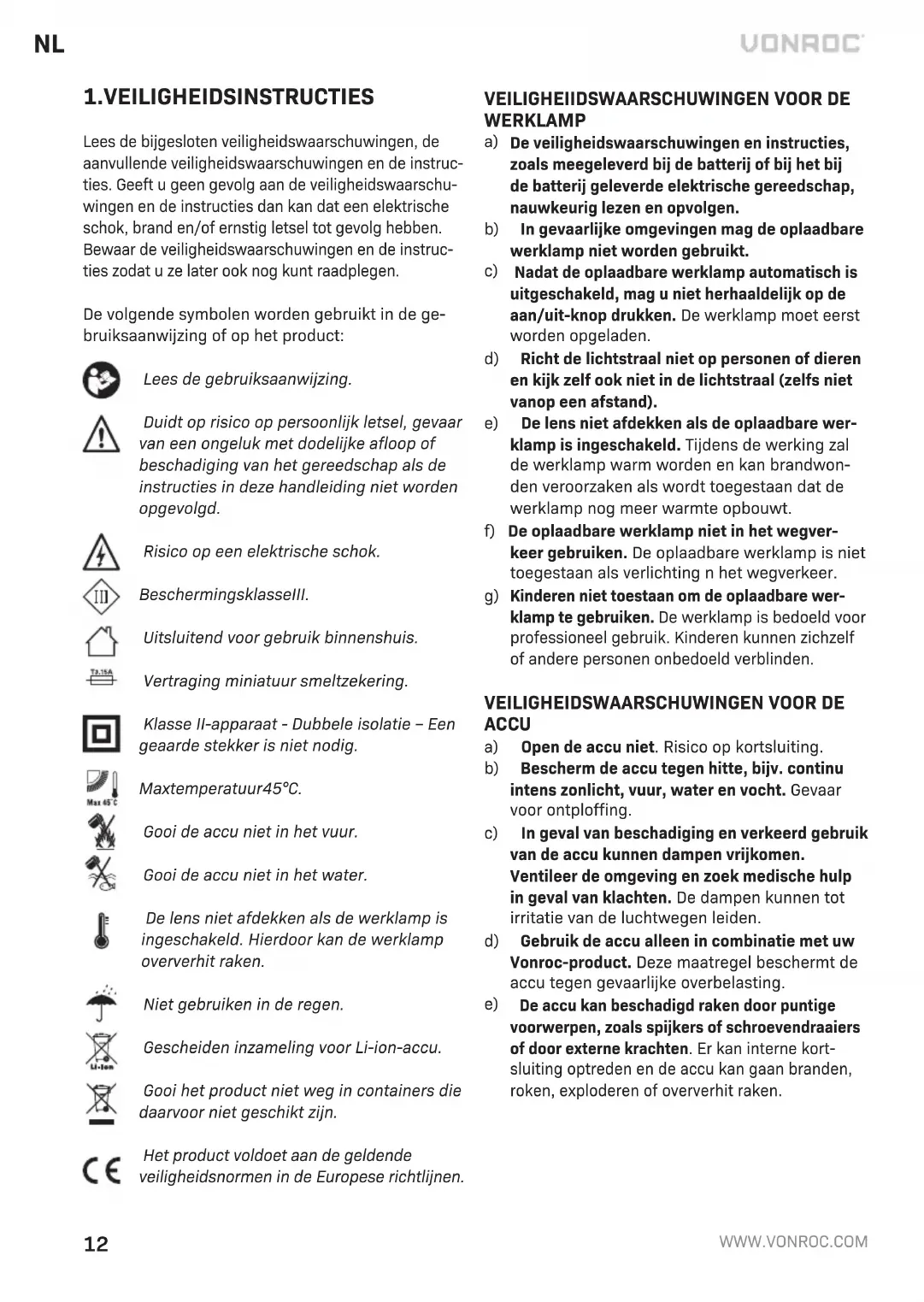 ACCU a) Open de accu niet. Risico op kortsluiting. b) Bescherm de accu tegen hitte, bijv. continu intens zonlicht, vuur, water en vocht. Gevaar voor ontploffing. c) In geval van beschadiging en verkeerd gebruik van de accu kunnen dampen vrijkomen. Ventileer de omgeving en zoek medische hulp in geval van klachten. De dampen kunnen tot irritatie van de luchtwegen leiden. d) Gebruik de accu alleen in combinatie met uw Vonroc-product. Deze maatregel beschermt de accu tegen gevaarlijke overbelasting.
