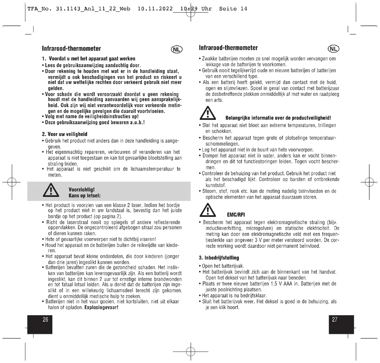 Dit product en de verpakking zijn vervaardigd van hoogwaardige materialen en onderdelen, die kunnen worden gerecycled en herge- bruikt. Dit vermindert afval en spaart het milieu. Voer de verpakking op milieuvriendelijke wijze af via de daarvoor bestemde inzamelsystemen. Afvoeren van het elektrisch apparaat Verwijder niet vast ingebouwde batterijen en accu’s uit het apparaat en voer die gescheiden af. Dit apparaat is gemarkeerd in overeenstemming met de EU-richtlijn (WEEE) betreffende afgedankte elektrische en elektronische apparatuur. Dit product mag niet met het huisvuil worden wegge- gooid. De gebruiker is verplicht om de apparatuur in te leveren bij een als zodanig erkende inleverpunt voor het afvoeren van afgedankte elektrische en elektronische apparatuur om een milieuvriendelijk afvoeren te garan- deren. Inleveren is gratis. Neem de geldende voorschrif- ten in acht! TFA_No. 31.1143_Anl_11_22_Web 10.11.2022 10:29 Uhr Seite 15Infrarood-thermometer