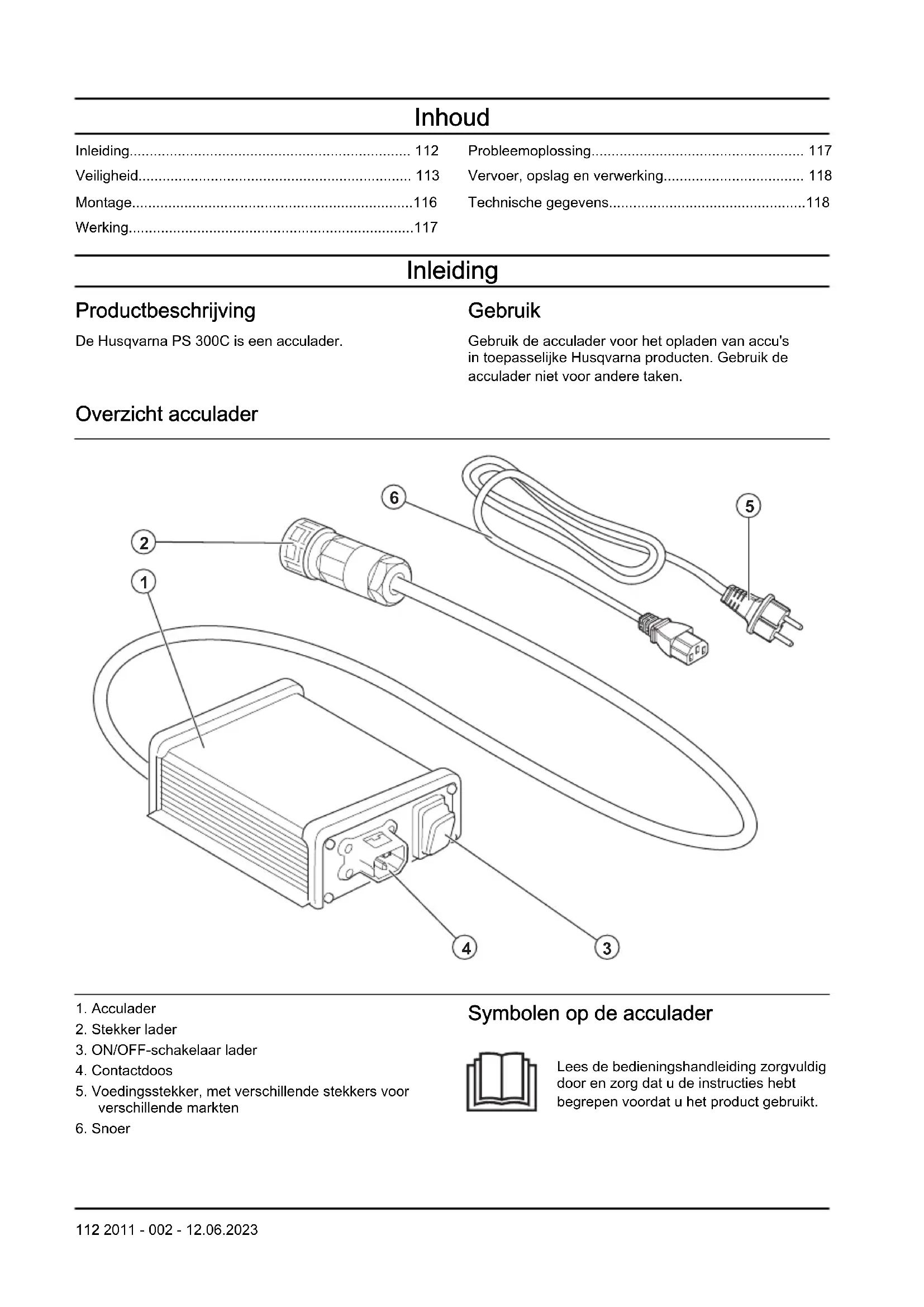 Symbolen op de acculader Lees de bedieningshandleiding zorgvuldig door en zorg dat u de instructies hebt begrepen voordat u het product gebruikt. 112 2011 - 002 - 12.06.2023De acculader voldoet aan de geldende EG-richtlijnen. Deze acculader voldoet aan de geldende VK-regelgeving. IP54 - De acculader is beschermd tegen stof en opspattend water. De acculader of de verpakking van de acculader horen niet bij het huishoudelijk afval. Lever het in bij een geschikte verwijderingslocatie voor elektrische en elektronische apparatuur. Scanbare code. Let op: Andere symbolen/stickers op de acculader hebben betrekking op certificeringseisen voor een aantal commerciële markten. Veiligheid Veiligheidsdefinities Waarschuwingen, voorzorgsmaatregelen en opmerkingen worden gebruikt om te wijzen op belangrijke delen van de handleiding. WAARSCHUWING: Wordt gebruikt om te wijzen op de kans op ernstig of fataal letsel voor de gebruiker of omstanders wanneer de instructies in de handleiding niet worden gevolgd. OPGELET: Wordt gebruikt indien er een risico bestaat op schade aan het product en andere eigendommen of aan de omgeving wanneer de instructies in de handleiding niet worden gevolgd. Let op: Geven verdere informatie die nodig is in een bepaalde situatie. Belangrijke veiligheidsinstructies WAARSCHUWING: Lees alle veiligheidswaarschuwingen en alle instructies. Het niet opvolgen van de waarschuwingen en instructies kan leiden tot elektrische schokken, brand en/of ernstig letsel. Let op: Bewaar alle waarschuwingen en instructies.