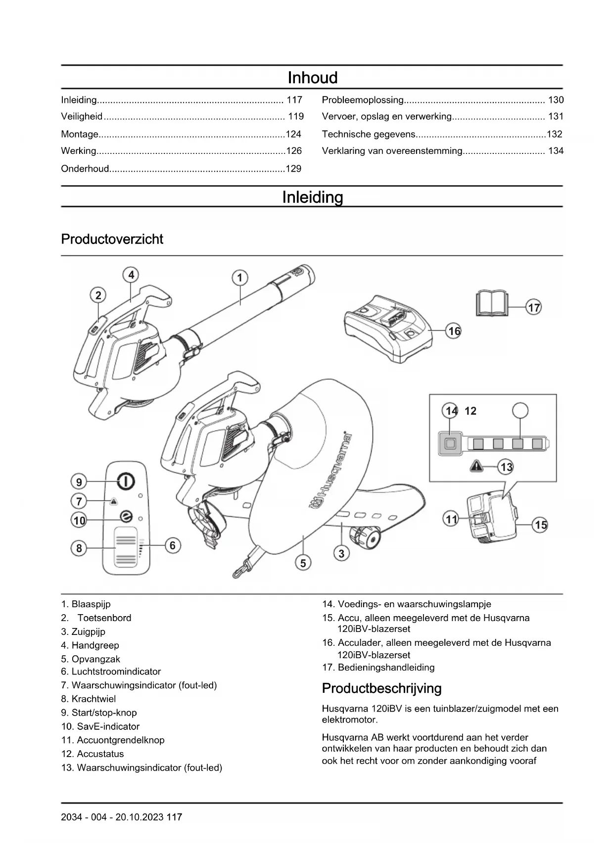 Productbeschrijving Husqvarna 120iBV is een tuinblazer/zuigmodel met een elektromotor. Husqvarna AB werkt voortdurend aan het verder ontwikkelen van haar producten en behoudt zich dan ook het recht voor om zonder aankondiging vooraf 2034 - 004 - 20.10.2023 117wijzigingen in o.a. de vorm en het uiterlijk door te voeren. Gebruik Blaasstand: De bladblazer is ontworpen om vuildeeltjes of gemaaid gras weg te blazen van paden, opritten, binnenplaatsen en dergelijke. Het is ook ontworpen voor het wegblazen van gemaaid gras, stro of bladeren om stapels te creëren of om vuildeeltjes uit hoeken, voegen of spleten tussen tegels of stenen te verwijderen. Zuigstand: De zuiger is ontworpen voor het opzuigen van droog materiaal. Dit omvat bladeren, gras, kleine takjes en stukjes papier. Symbolen op het product WAARSCHUWING: Dit product kan gevaarlijk zijn en ernstig of fataal letsel toebrengen aan de gebruiker of anderen. Wees voorzichtig en gebruik het product op de juiste manier. Lees de bedieningshandleiding goed door en zorg dat u de instructies hebt begrepen voordat u dit product gaat gebruiken. Gebruik goedgekeurde oogbescherming. Nominale spanning, V Gelijkstroom. Geluidsemissies naar het omgevingslabel volgens de richtlijnen en voorschriften van de EU en het VK en de wetgeving van Nieuw-Zuid-Wales "Protection of the Environment Operations (Noise Control) Regulation 2017". Het gegarandeerde geluidsvermogensniveau van het product staat vermeld in Technische gegevens op pagina 132 en op het label. Koppel de accu voorafgaand aan het onderhoud los. Het product of de verpakking ervan is geen huishoudelijk afval. Lever het in bij een recyclepunt voor elektrische en elektronische apparatuur. Het product voldoet aan de geldende EG- richtlijnen. Dit product voldoet aan de geldende VK- regelgeving. Stel het product niet bloot aan regen. Wacht tot de rotorbladen stoppen nadat u het pro- duct hebt uitgeschakeld. Gebruik het product al- leen in vacuümmodus als de buis volledig is gemon- teerd. De gebruiker van de bladblazer dient ervoor te zorgen dat geen mensen of dieren dichterbij komen dan 15 meter. Indien meerdere gebruikers werken in hetzelfde werkgebied, is de onderlin- ge veiligheidsafstand min. 15 meter. De bladblazer kan voorwerpen met geweld wegslingeren, die terug kun- nen kaatsen. Dit kan leiden tot ern- stig oogletsel, als de aanbevolen vei- ligheidsuitrusting niet wordt gebruikt. yyyy wwxxxxx Het serienummer staat op het pro- ductplaatje. yyyy is het productiejaar, ww is de productieweek. Let op: Overige op het opzetstuk aangegeven symbolen/plaatjes verwijzen naar specifieke eisen aan certificering voor bepaalde markten. Symbolen op de accu en/of op de accuhouder. Lever dit product in bij een re- cyclepunt voor elektrische en elektronische apparatuur. (Al- leen geldig voor Europa) 118 2034 - 004 - 20.10.2023Faalveilige transformator. Bewaar en gebruik de acculader alleen binnen. Dubbele isolatie. Fabrikant Husqvarna AB Drottninggatan 2, SE-561 82 Huskvarna Schade aan het product We zijn niet verantwoordelijk voor schade aan ons product als: