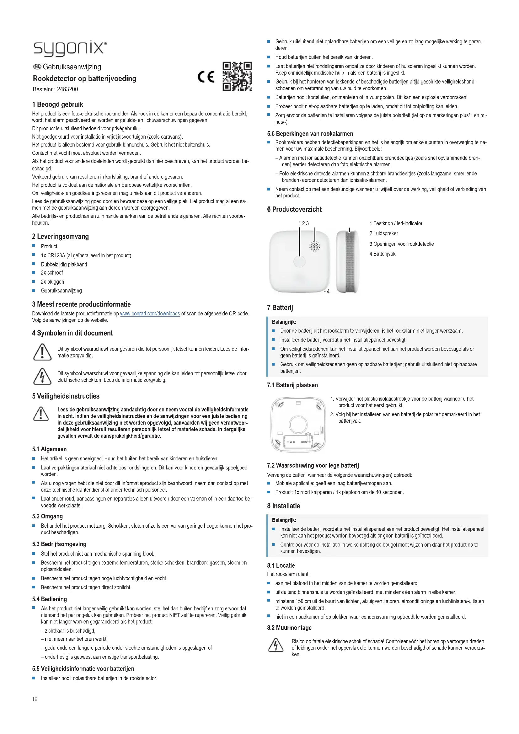 3 V CC (CR123A/2 years) Chaque fois que la pile est remplacée, l'alarme fonctionne correctement. Protocol: Wi-Fi Détecteur de fumée ZR150SW Distribué par Conrad Electronic SE, Klaus-Conrad-Str. 1, D-92240 Hirschau Testé selon les normes : EN 14604:2005 EN 14604: 2005/AC:2008 WEEE-Reg.-Nr.:DE28001718 Ceci est une publication de Conrad Electronic SE, Klaus-Conrad-Str. 1, D-92240 Hirschau (www.conrad.com). Tous droits réservés, y compris de traduction. Toute reproduction, quelle qu‘elle soit (p. ex. photocopie, microfilm, saisie dans des installations de traitement de données) nécessite une autorisation écrite de l‘éditeur. Il est interdit de le réimpri- mer, même par extraits. Cette publication correspond au niveau technique du moment de la mise sous presse. Copyright by Conrad Electronic SE. *2483200_V1_0522_dh_mh_fr 18014398929079307-3 I3/O1 en10 Gebruiksaanwijzing Rookdetector op batterijvoeding Bestelnr.: 2483200 1 Beoogd gebruik Het product is een foto-elektrische rookmelder. Als rook in de kamer een bepaalde concentratie bereikt, wordt het alarm geactiveerd en worden er geluids- en lichtwaarschuwingen gegeven. Dit product is uitsluitend bedoeld voor privégebruik. Niet goedgekeurd voor installatie in vrijetijdsvoertuigen (zoals caravans). Het product is alleen bestemd voor gebruik binnenshuis. Gebruik het niet buitenshuis. Contact met vocht moet absoluut worden vermeden. Als het product voor andere doeleinden wordt gebruikt dan hier beschreven, kan het product worden be- schadigd. Verkeerd gebruik kan resulteren in kortsluiting, brand of andere gevaren. Het product is voldoet aan de nationale en Europese wettelijke voorschriften. Om veiligheids- en goedkeuringsredenen mag u niets aan dit product veranderen. Lees de gebruiksaanwijzing goed door en bewaar deze op een veilige plek. Het product mag alleen sa- men met de gebruiksaanwijzing aan derden worden doorgegeven. Alle bedrijfs- en productnamen zijn handelsmerken van de betreffende eigenaren. Alle rechten voorbe- houden. 2 Leveringsomvang