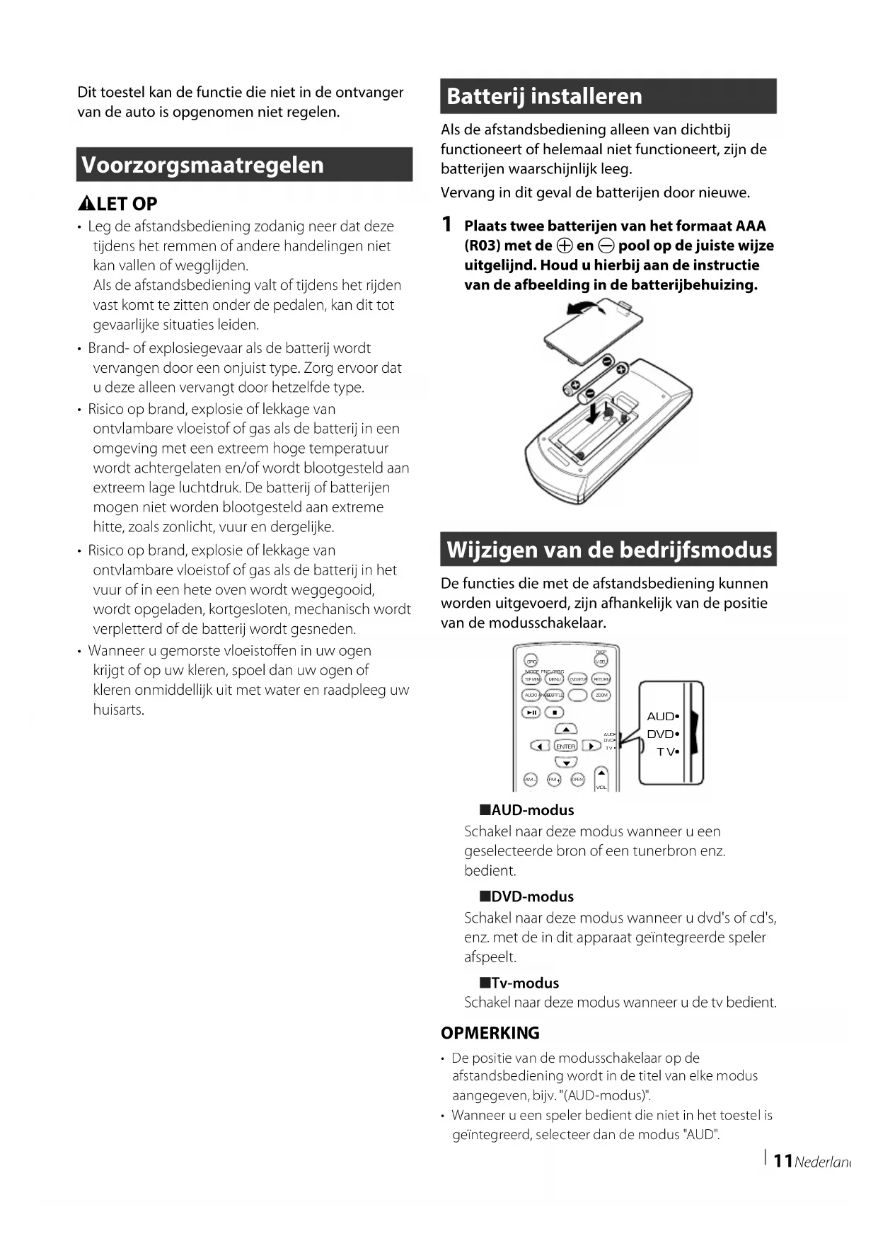 ■ AUD-modus Schakel naar deze modus wanneer u een geselecteerde bron of een tunerbron enz. bedient. ■ DVD-modus Schakel naar deze modus wanneer u dvd's of cd's, enz. met de in dit apparaat geïntegreerde speler afspeelt. ■ Tv-modus Schakel naar deze modus wanneer u de tv bedient. OPMERKING