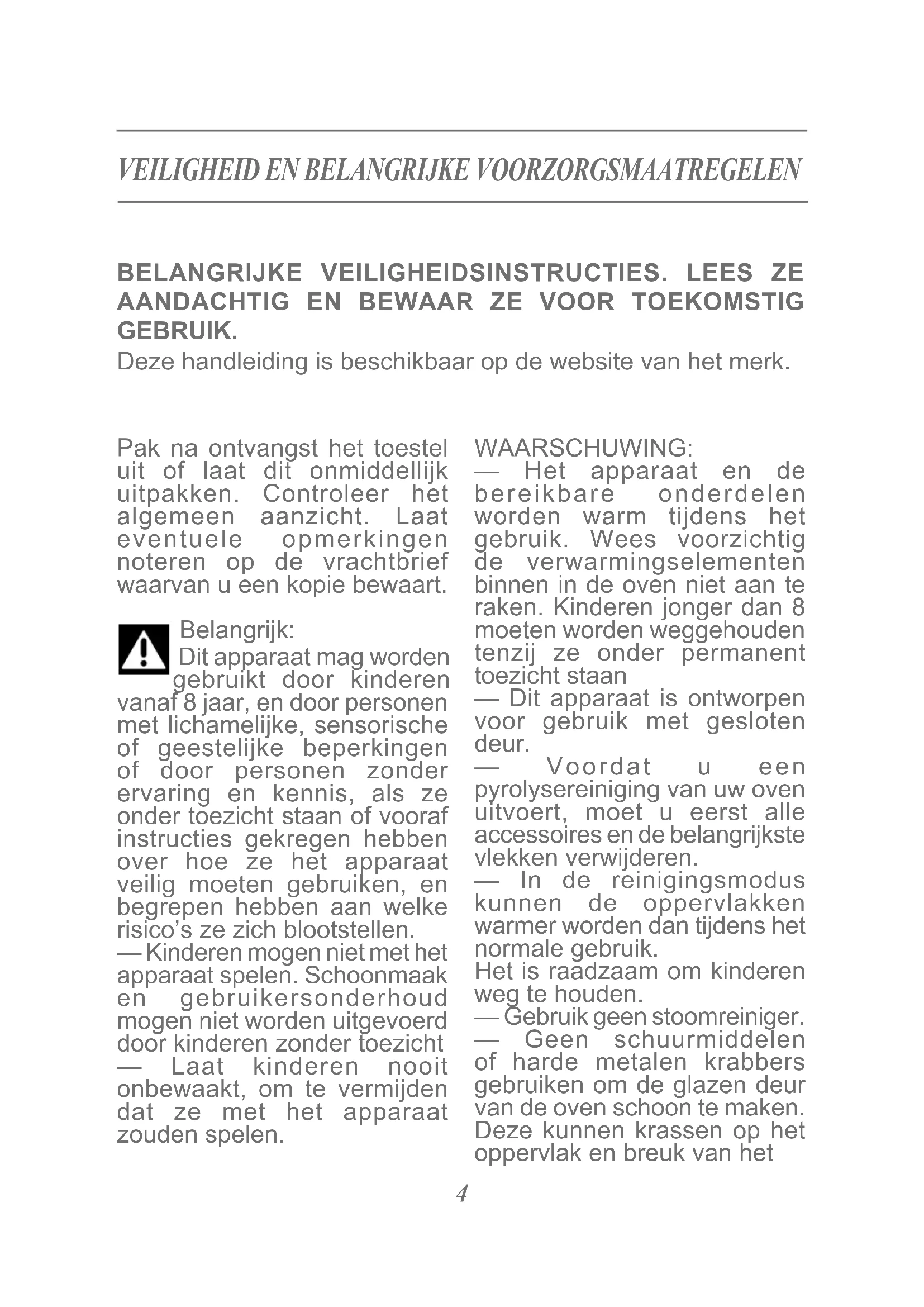 Pak na ontvangst het toestel uit of laat dit onmiddellijk uitpakken. Controleer het algemeen aanzicht. Laat eventuele opmerkingen noteren op de vrachtbrief waarvan u een kopie bewaart. Belangrijk: Dit apparaat mag worden gebruikt door kinderen vanaf 8 jaar, en door personen met lichamelijke, sensorische of geestelijke beperkingen of door personen zonder ervaring en kennis, als ze onder toezicht staan of vooraf instructies gekregen hebben over hoe ze het apparaat veilig moeten gebruiken, en begrepen hebben aan welke risico’s ze zich blootstellen. — Kinderen mogen niet met het apparaat spelen. Schoonmaak en gebruikersonderhoud mogen niet worden uitgevoerd door kinderen zonder toezicht — Laat kinderen nooit onbewaakt, om te vermijden dat ze met het apparaat zouden spelen. WAARSCHUWING: — Het apparaat en de bereikbare onderdelen worden warm tijdens het gebruik. Wees voorzichtig de verwarmingselementen binnen in de oven niet aan te raken. Kinderen jonger dan 8 moeten worden weggehouden tenzij ze onder permanent toezicht staan — Dit apparaat is ontworpen voor gebruik met gesloten deur. — Voordat u een pyrolysereiniging van uw oven uitvoert, moet u eerst alle accessoires en de belangrijkste vlekken verwijderen. — In de reinigingsmodus kunnen de oppervlakken warmer worden dan tijdens het normale gebruik. Het is raadzaam om kinderen weg te houden. — Gebruik geen stoomreiniger. — Geen schuurmiddelen of harde metalen krabbers gebruiken om de glazen deur van de oven schoon te maken. Deze kunnen krassen op het oppervlak en breuk van het